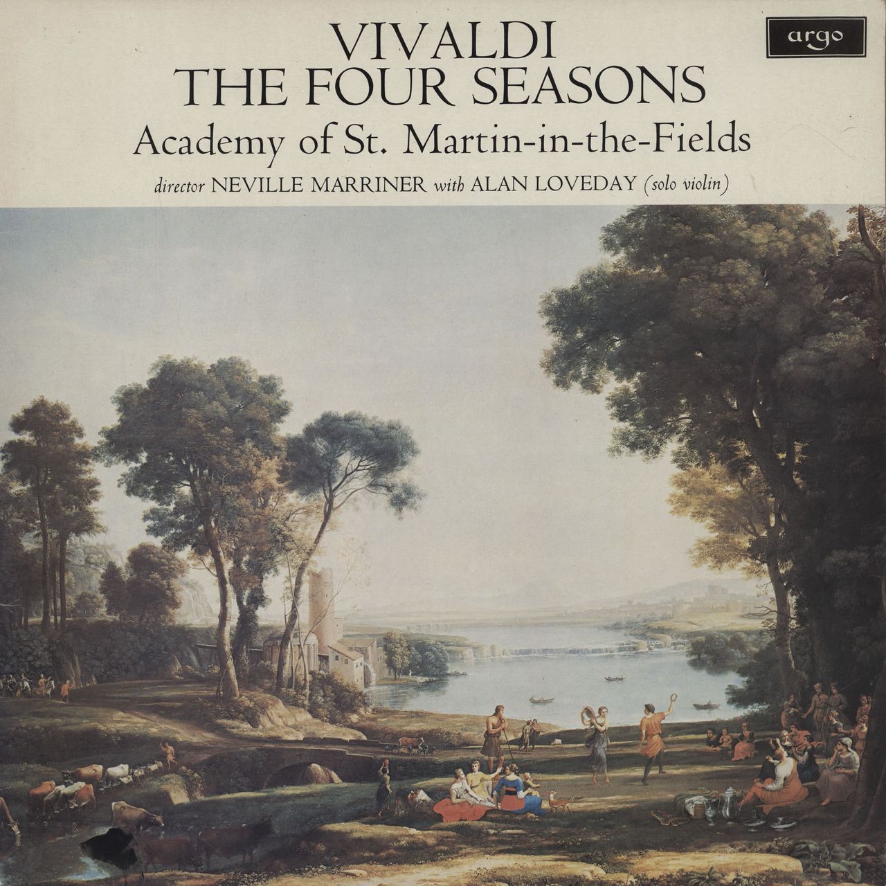 THE ACADEMY OF ST. MARTIN-IN-THE-FIELDS conducted by NEVILLE MARRINER Vivaldi: The Four Seasons (1973 UK second issue of the 1970 stereo LP on the rectangular boxed Argo label, also featuring Alan Loveday on Violin & Simon Preston on Harpsichord & Organ, complete with libretto insert, picture sleeve. The sleeve and vinyl are Near Mint ZRG654)