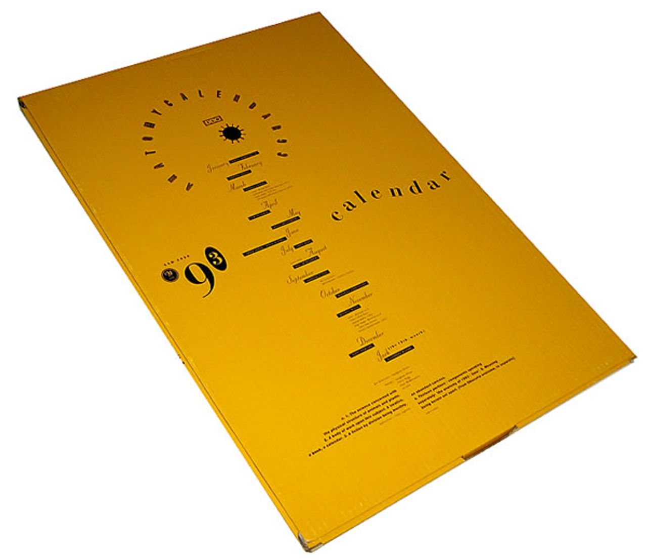 4AD Anatomy Calendar 93 (Extremely rare 1993 UK mail-order only oversized 24" x 16" spiral-bound 12-month calendar [which has an additional page for a 13th month]. Designed and directed by Vaughan Oliver, the calendar features stunning artwork by Chris Bigg, Paul McMenamin, Simon Larbalestier, Dominic Davies, Shinro Ohtake, Jim Friedman, Kevin Westenberg, Tamar Cohen, David Slatoff, Beverley Carruthers, Russell Mills, Terry Dowling and Alexandra Murray. Printed on heavy paper stock with a glossy illustrated front cover and protective cardboard back cover. This copy is in stunning condition and still housed in the original custom printed yellow outer box XAD2020 - One of the rarest 4AD items to be found!)