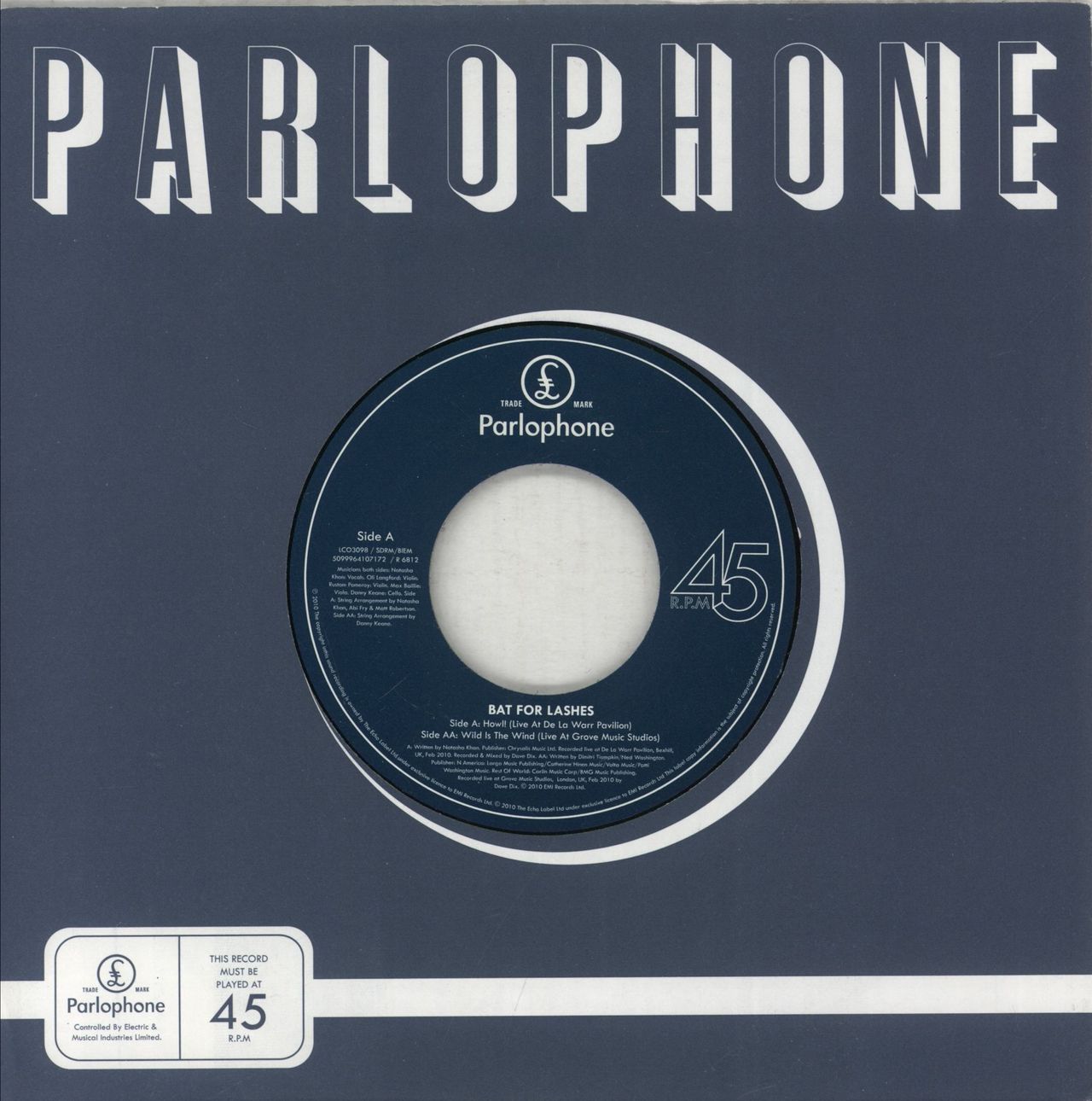 BAT FOR LASHES Howl! / Wild Is The Wind (2010 UK strictly limited edition 7" wide centred single [released as part of Record Store Day] featuring previously unreleased live recordings of 'Howl!' [live at the De La Warr Pavillion] and 'Wild Is TheWind' [live at Grove Music Studios], which sees Natasha performing with a string quartet, vintage-style paper Parlophone die cut company sleeve R6812)