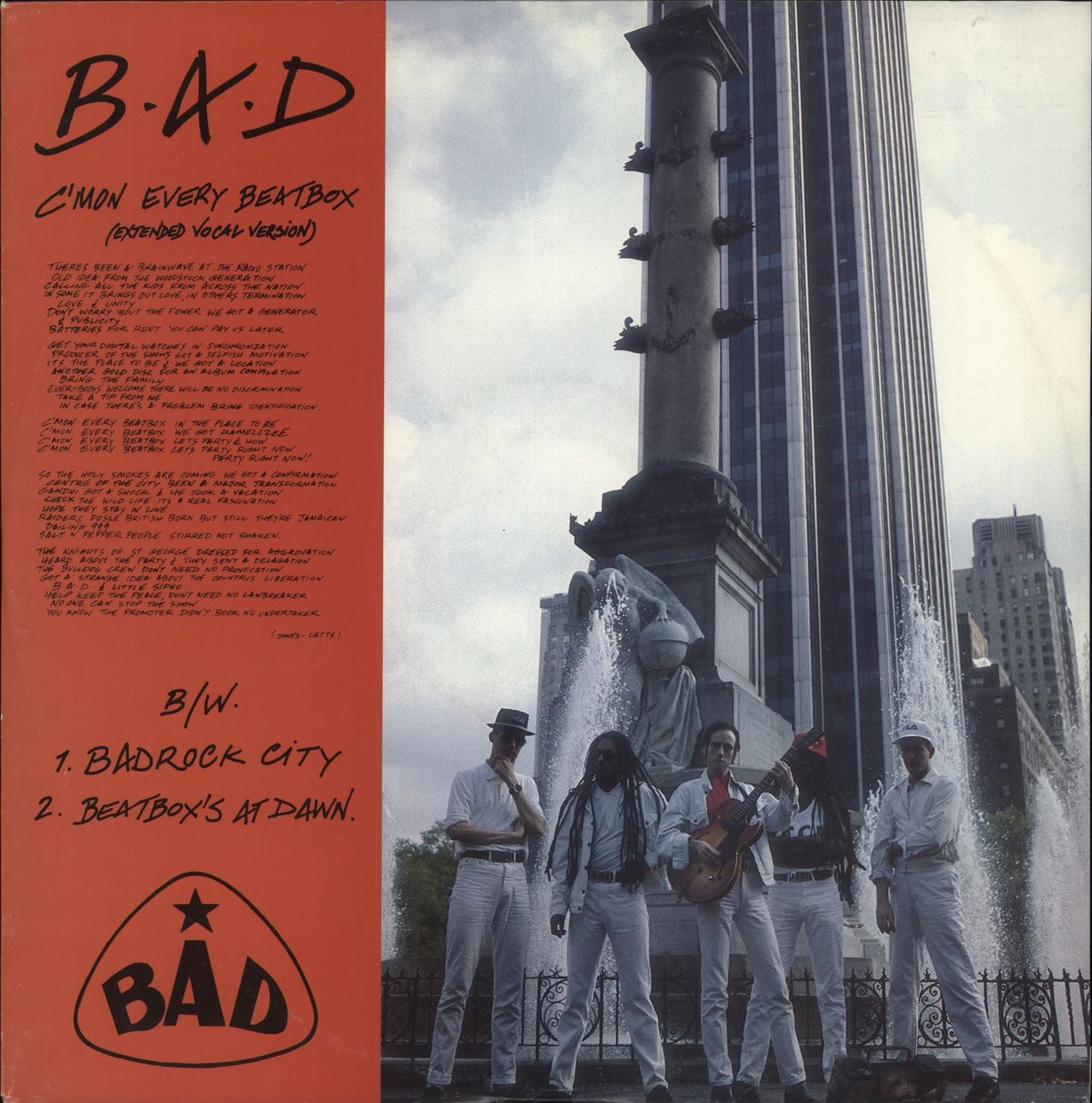 BIG AUDIO DYNAMITE C'mon Every Beatbox (1986 UK 3-track 12" single, including the Extended Vocal Version, Bad Rock City and Beatbox's At Dawn, picture sleeve with gold-promo stamp. The sleeve shows just a little light ring wearwhilst the vinyl looks seldom played)