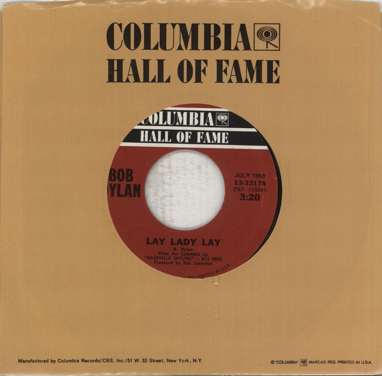 BOB DYLAN Lay Lady Lay (1975 US 'Hall Of Fame' series wide-centred 7" vinyl single, also including I Threw It All Away. Issued in the gold hall of fame die-cut paper sleeve, the vinyl appears in Excellent condition)