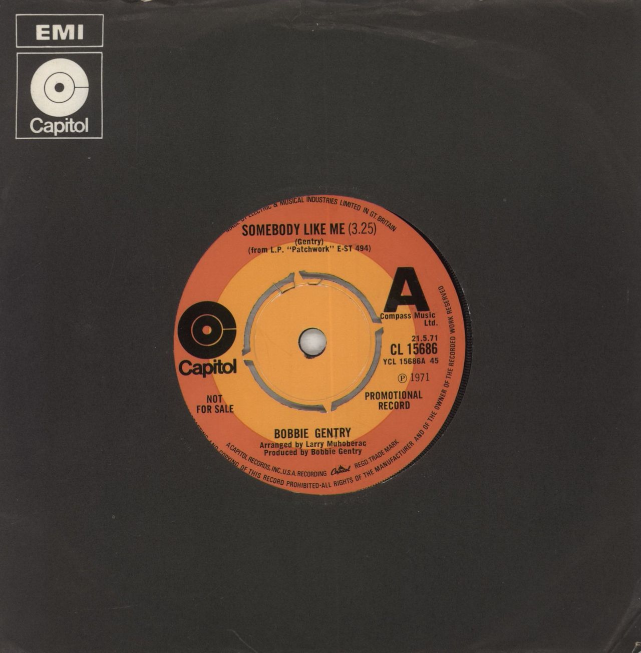 BOBBIE GENTRY Somebody Like Me (Rare 1971 UK 'A' label promotional vinyl 7" for the single release with an intact four prong centre, also including Benjamin, in an EMI Capitol company die-cut paper sleeve. The vinyl remains in a really nice condition with minimal signs of play CL15686)