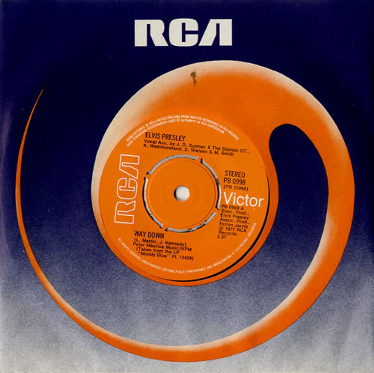 ELVIS PRESLEY Way Down (1977 UK 7" vinyl single with intact four prong centre, also featuring Pledging My Love, RCA company die-cut paper sleeve PB0998)
