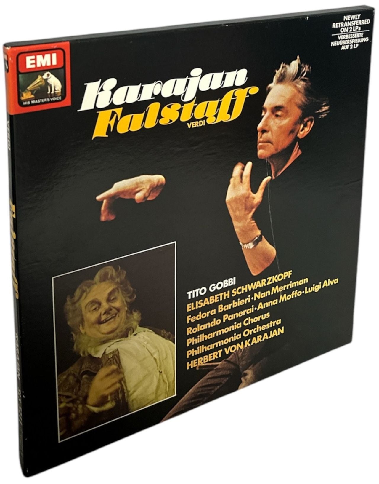 HERBERT VON KARAJAN conducts the PHILHARMONIA ORCHESTRA Verdi: Falstaff (1980s UK issue of the 1957 7-track double vinyl LP on the 'Nipper' semi-circle label, featuring Elisabeth Schwarzkopf, picture box with 26-page libertto booklet. The boxshows minimal wear and the vinyl is Near Mint SLS5211)