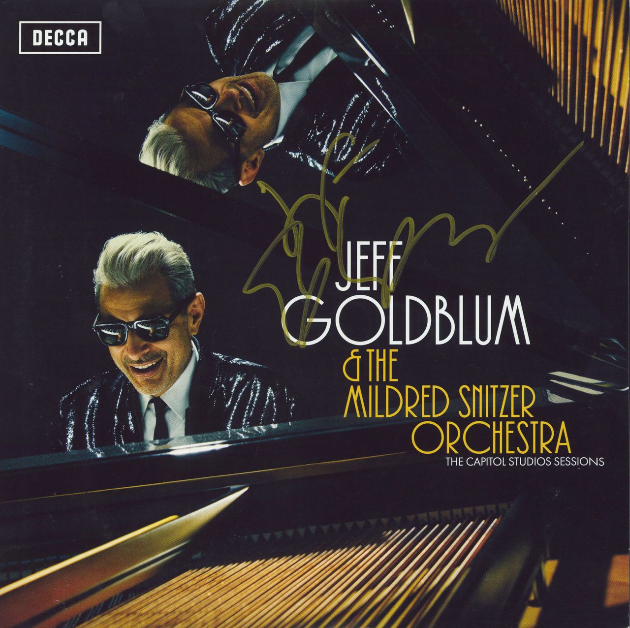 JEFF GOLDBLUM & THE MILDRED SNITZER ORCHESTRA The Capitol Studios Sessions (Rare 2018 UK/EU-pressed AUTOGRAPHED 14-track double LP, recorded live at Capitol Studios & guest starring the great Imelda May. Housed in a deluxe gatefold picture sleeve with illustrated credit inners. The front of the sleeve has been signed by Jeff Goldblum in black marker pen)