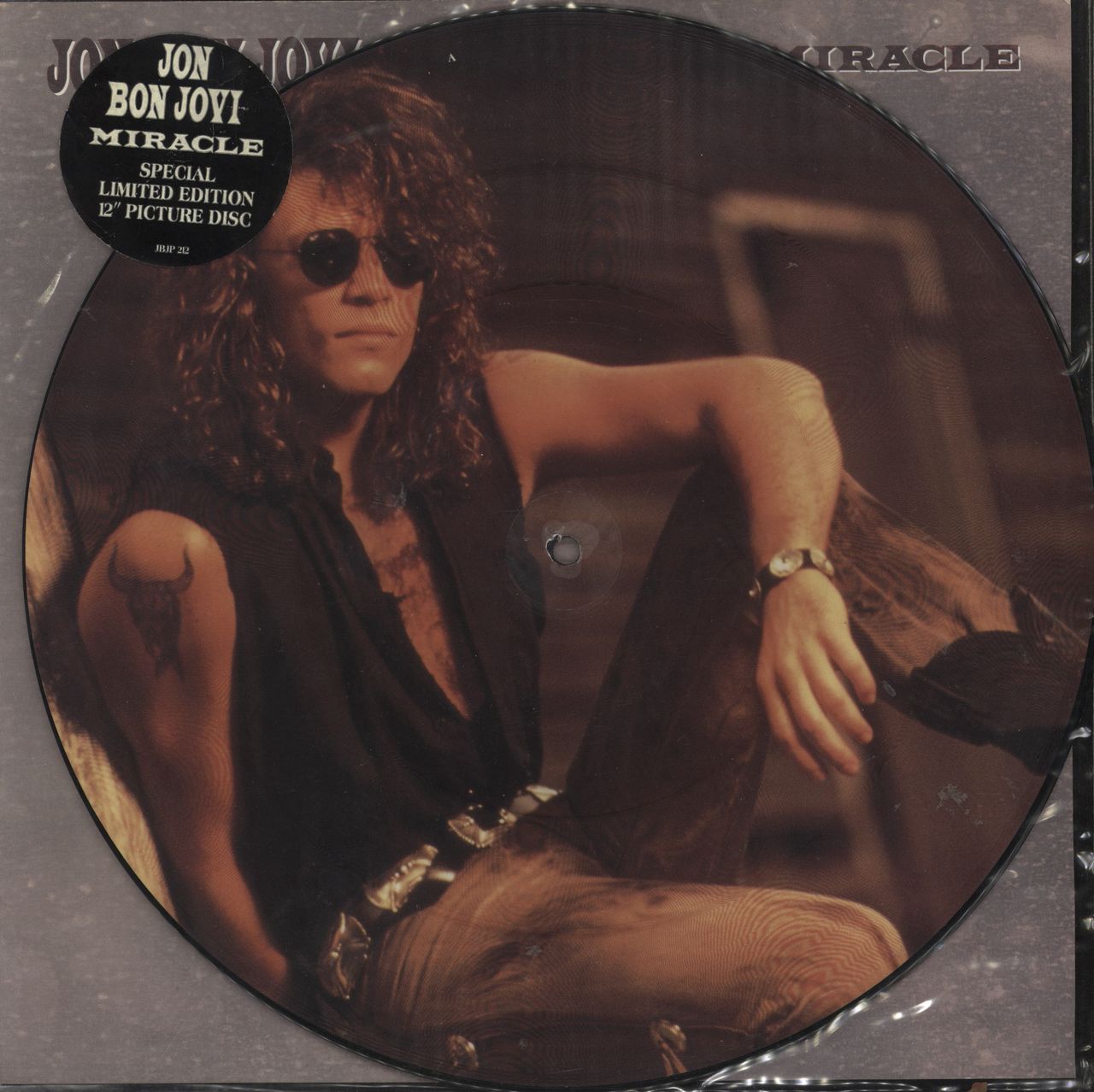 JON BON JOVI Miracle (1990 UK limited edition 3-track 12" Picture Disc single, also including Dyin' Ain't Much Of A Livin' & the previously unreleased Going Back [recorded Live In London], stickered clear PVC sleeve with hype sticker and back picture insert JBJP212)