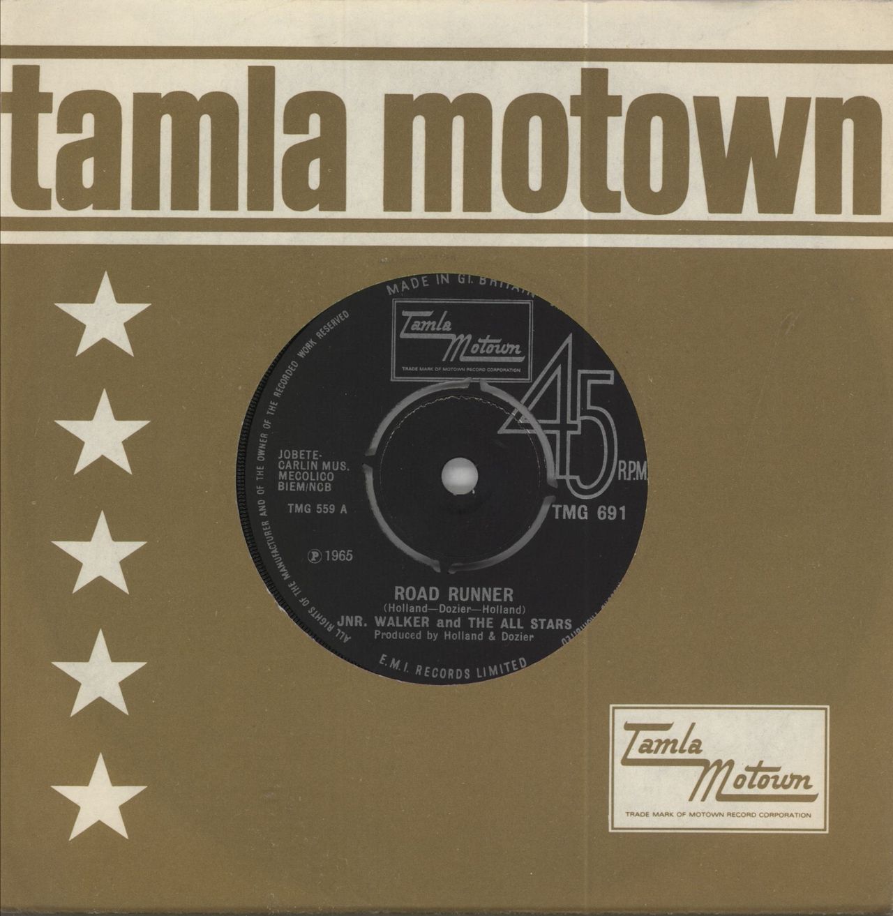 JUNIOR WALKER & THE ALL STARS Road Runner (1969 UK second issue 7" vinyl single with intact four prong centre, also including Shotgun, Tamla Motown company die cut paper sleeve TMG691)