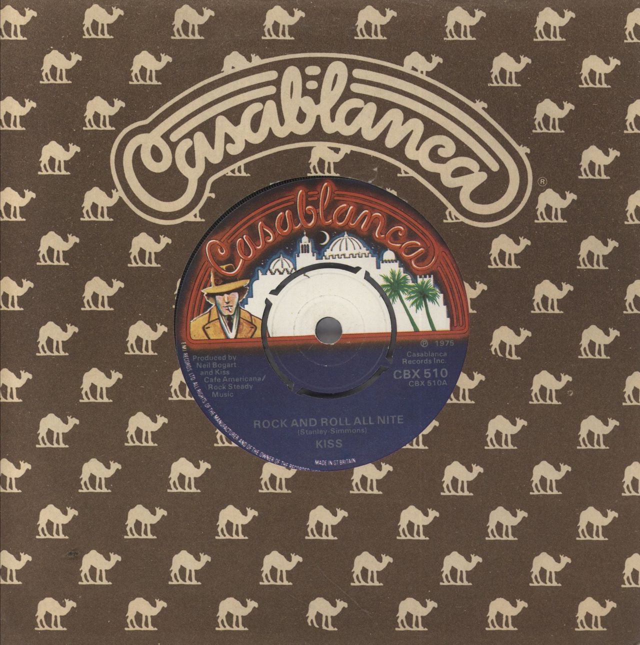KISS Rock And Roll All Nite (Scarce 1975 UK 7" vinyl single with blue 'Bogart' labels and an intact four prong centre, also including Anything For My Baby, housed in a Casablanca company die-cut paper sleeve. The vinyl has a cloudy effect to the playing surface from being stored in a PVC sleeve for many years, but plays through without out any issues, an Excellent example CBX510)