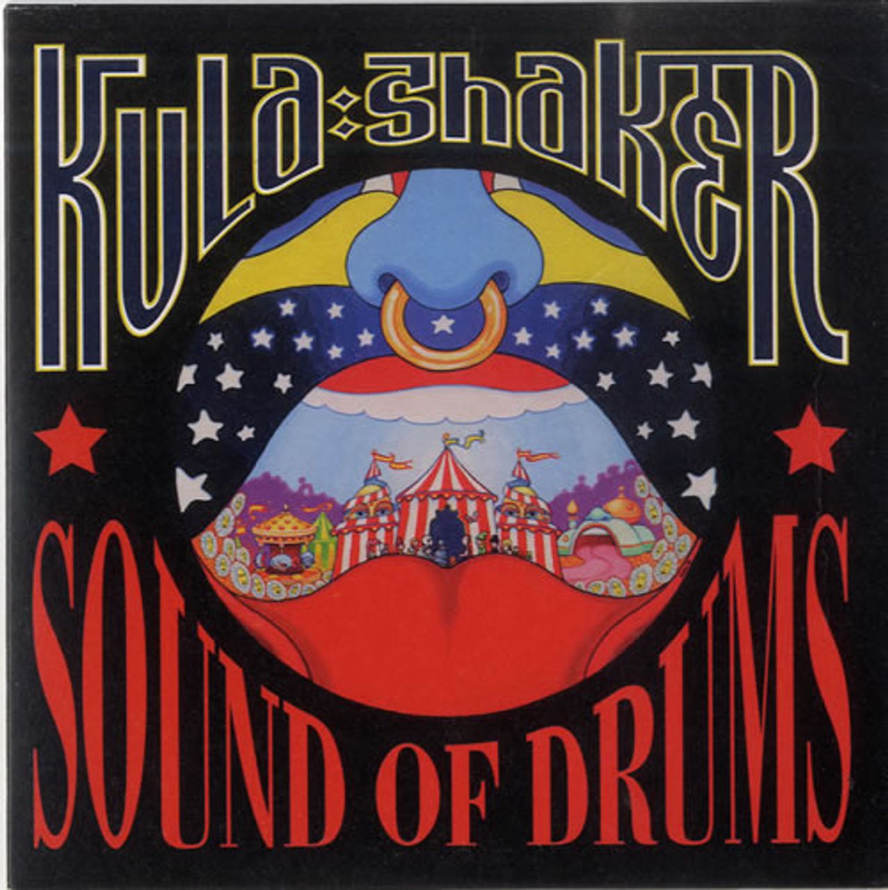 KULA SHAKER Sound Of Drums (1998 UK 4-track CD single [CD1 of 2] featuring the Album Version plus Hurry On Sundown [Hari Om Sundown], Reflections Of Love and Fairyland, card picture sleeve. The disc shows light play and card sleeve has minimalcreasing KULA21CD)