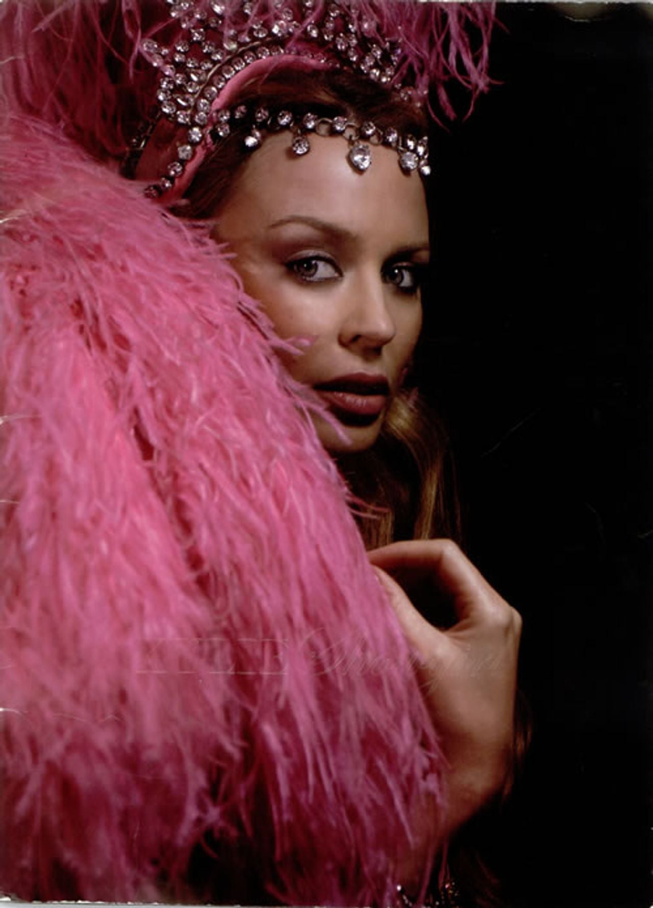features a beautiful picture of Kylie wearing a pink feather and