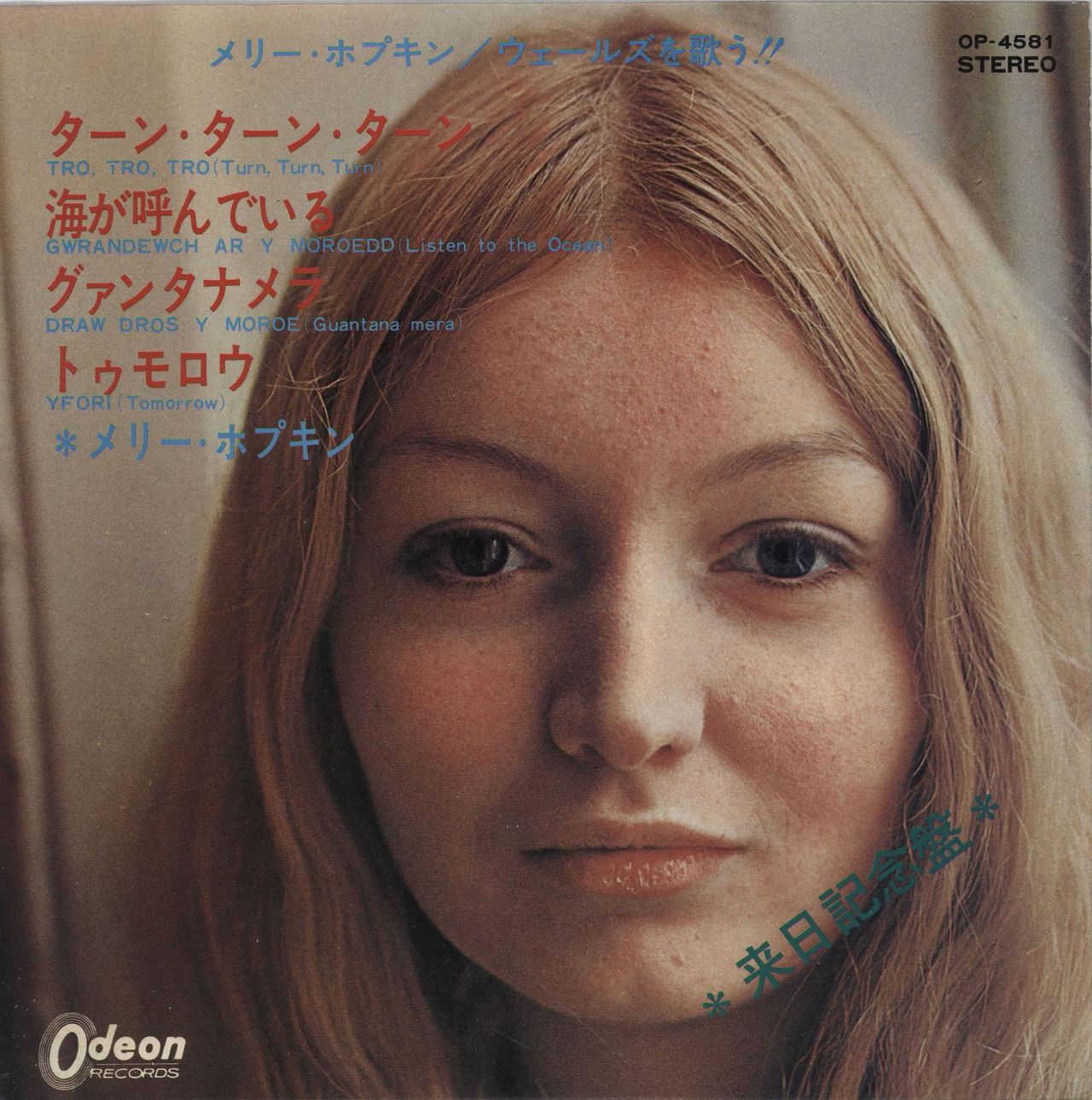 MARY HOPKIN Tro, Tro, Tro (Turn, Turn, Turn) (1970 Japanese only solid centre 4-track 7" vinyl EP on the black & silver Odeon label, also including Gwrandewch Ar Y Moroedd (Listen To The Ocean), Draw Dros Y Moroe (Guantana Mera) and Yfori (Tomorrow), housed in a flipback style picture sleeve. The sleeve displays some lighg wear and signs of age, whilst the vinyl looks barely played OP-4581)