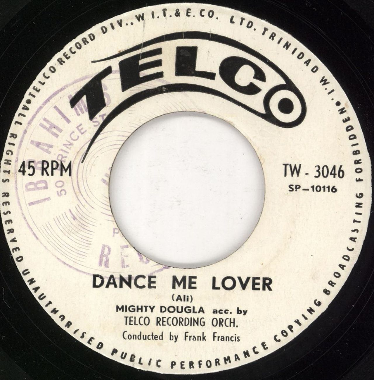 MIGHTY DOUGLA Dance Me Lover (1961 Trinidadian 7" vinyl single with wide centre, includes The Laziest Man, plain die-cut sleeve. The vinyl has just a few light scuffs to show for its years TW-3046)