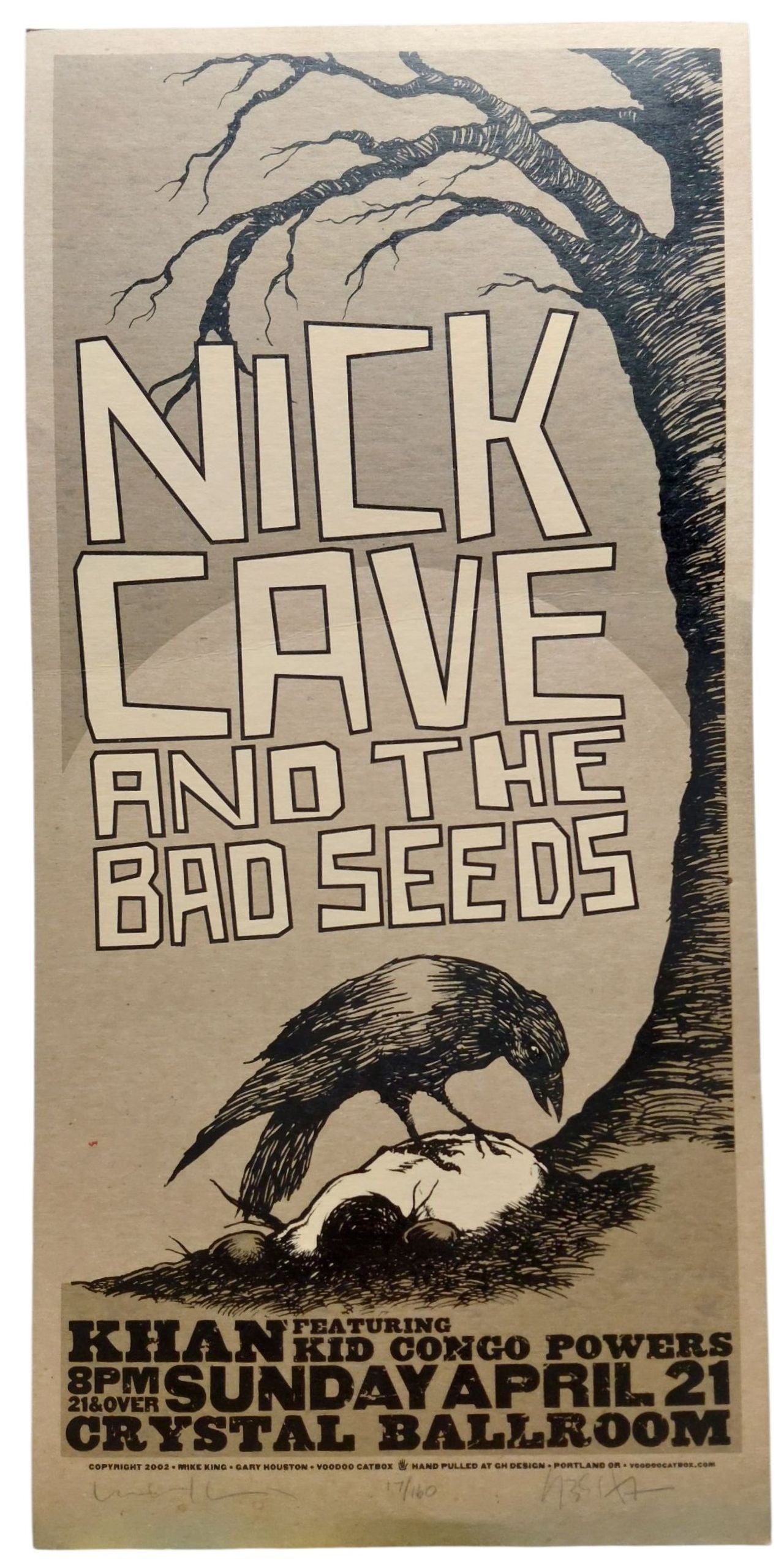 NICK CAVE Crystal Ballrom Poster (Rare signed, numbered limited 2002 US 12" x 25" silkscreen poster on chipboard, designed by Gary Houston and Mike King and printed by Voodoo Catbox. Expertly hand-pulled at GH Design, AoMR 151.3, with full printing and copyright credits along the lower edge above the artist signatures and hand-numbered edition details. Created for the 21st April 2002 Crystal Ballroom show in Portland, Oregon, featuring support from Khan and Kid Congo Powers, with all date and time information displayed beneath the bold, eye-catching artwork. Beautifully preserved, with only a faint line of surface creasing at the mid-point and a couple of tiny marks visible upon close inspection, otherwise bright, clean and impressively vivid, with no signs of previous wall display. An exceptionally limited piece of original concert art — this example being a desirable low number #17 of just 160 — and a perfect statement piece for prominent display!)
