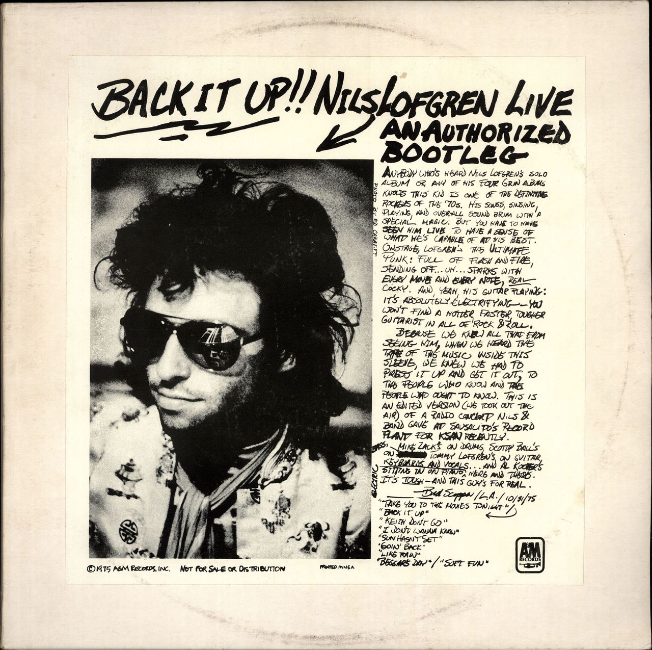 NILS LOFGREN Back It Up (1975 US 7-track promotional-only 'Authorized Bootleg' LP, with custom printed labels & special pasted picture sleeve. The sleeve has some minor foxing with the odd faint crease but no writing or tears, the vinyl is Excellent with only light signs of play SP-8362)