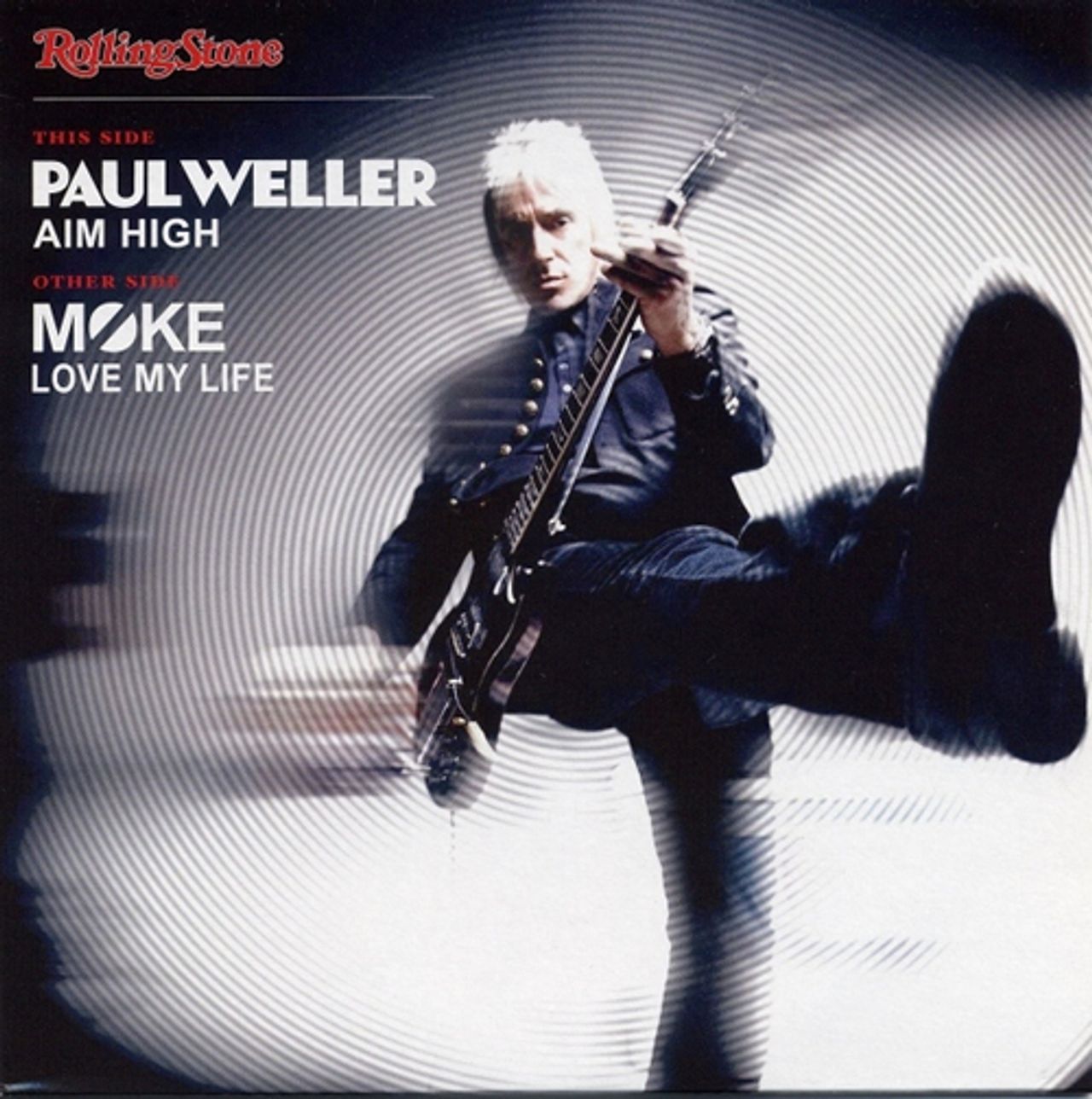PAUL WELLER Aim High (2010 German limited edition vinyl 7" issued exclusively with copies of the German Rolling Stone magazine [not available seperatly in record stores], also includes 'Love My Life' by Moke, housed in the glossy picture sleeve with images of Paul on the front and Moke on the reverse side. There is a little shelfwear evident to the sleeve but the vinyl appears in Near Mint condition)