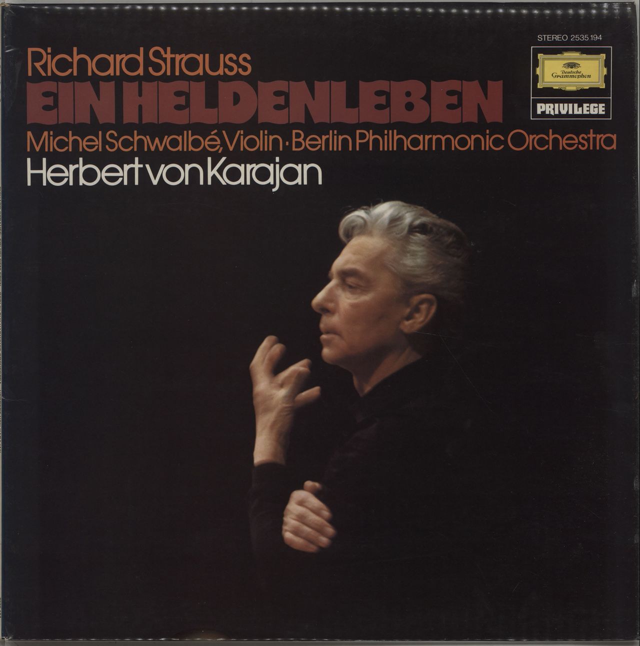HERBERT VON KARAJAN conducts THE BERLIN PHILHARMONIC ORCHESTRA Ein Heldenleben (1976 UK DGG small tulip label stereo LP, originally recorded in 1959 with star violinist Michel Schwalbé, laminated picture sleeve. The cover shows just the lightest spot of laminate lift & the vinyl is near mint)