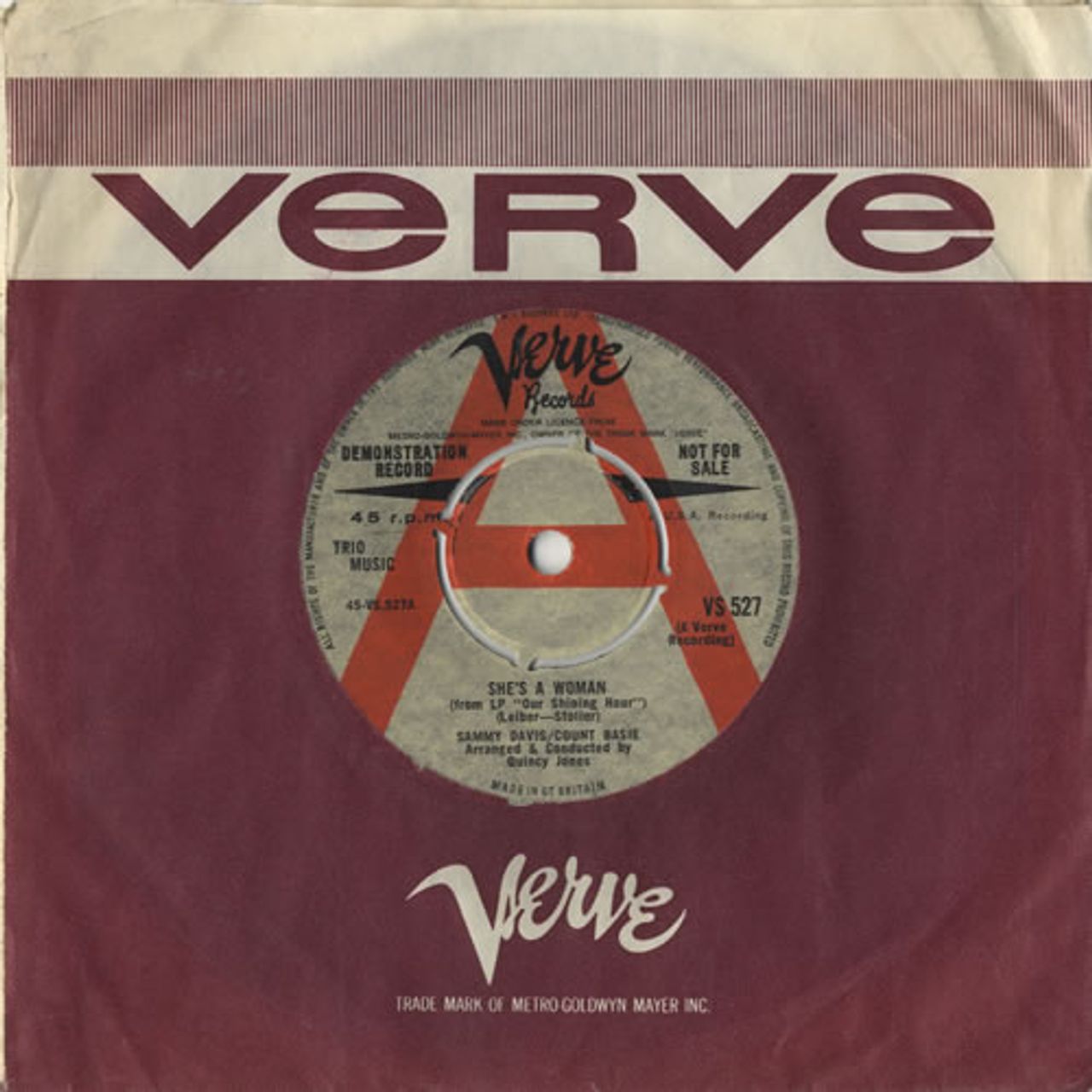 SAMMY DAVIS JR & COUNT BASIE She's A Woman (1965 UK 'A' label demonstration vinyl 7" for the single release, with intact original four prong centre, also including Blues For Mr Charlie, Verve company die cut paper sleeve VS527)