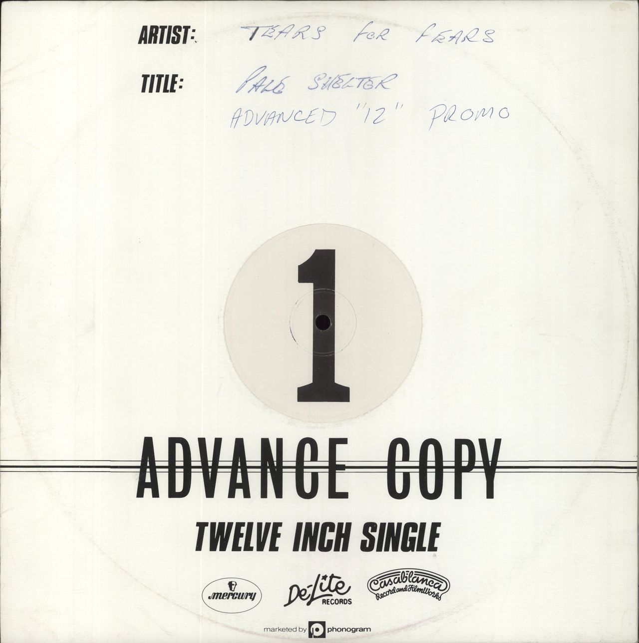 TEARS FOR FEARS Pale Shelter (Rare 1982 UK white label 'Advance' promotional vinyl 12" with '1'/'2' label print and die-cut 'Advance Copy' company sleeve with handwritten artist and title. The vinyl only has minimal signs of play, and a wonderful collectors item! IDEA212)
