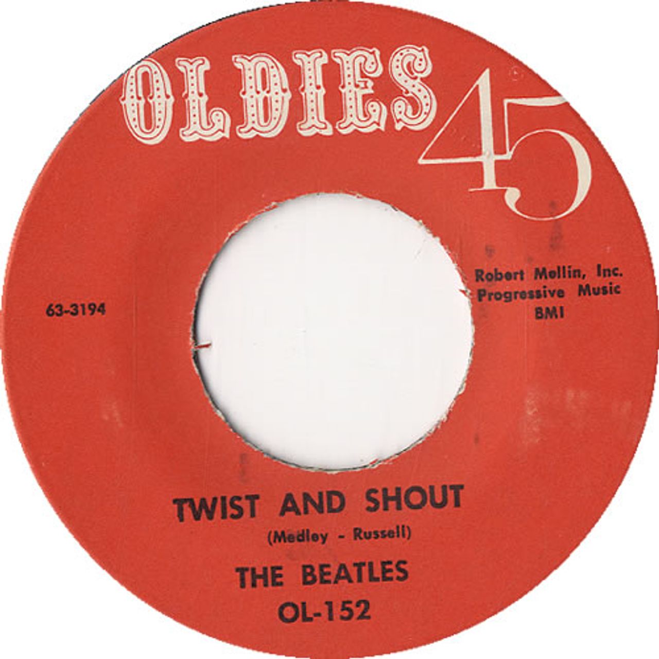THE BEATLES Twist And Shout (1964 US wide centred 7" vinyl single, also including There's A Place, plain die cut paper sleeve. This was a final attempt by Vee-Jay to milk their Beatles franchise. The vinyl has just a few very light, cosmeticmarks which have no effect on play OL-152)