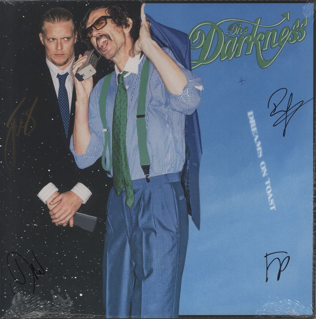 THE DARKNESS Dreams On Toast (2025 UK/EU FULLY AUTOGRAPHED Amazon exclusive limited edition 11-track LP pressed on Red Vinyl - the eighth studio album by the British hard rock band. Housed in an alternate picture sleeve with green title and Frankie's tie & braces, which has been signed by Justin, Dan, Frankie & Rufus in black and gold marker pen - shrinkwrap sealed after it had been signed COOKLP922AM)