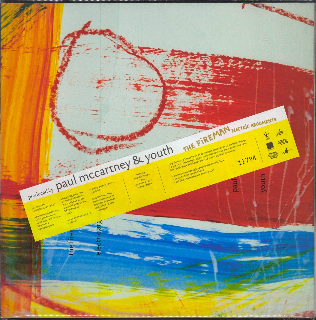 THE FIREMAN Electric Arguments (2008 UK limited edition 13-track double LP pressed on Direct Metal Mastered 200gram Virgin Vinyl - For those who don't know by now, The Fireman is a collaborative project between Paul McCartney andrevered producer Youth. For those expecting a Paul McCartney dance album, well, this isn't it, but it is an eclectic and diverse collection of songs that show Paul is still interested in pure musical possibilities. Both vinyl discs look barelyplayed and comes in the picture inners housed in the gatefold picture sleeve complete with a Bonus CD containing the entire album, 16-page picture booklet plus the individually numbered stickered clear PVC outer sleeve! The sleeve is free of signs of wear and the vinyl shows only the odd light cosmetic scuff and little evidence of play TPLP1003)