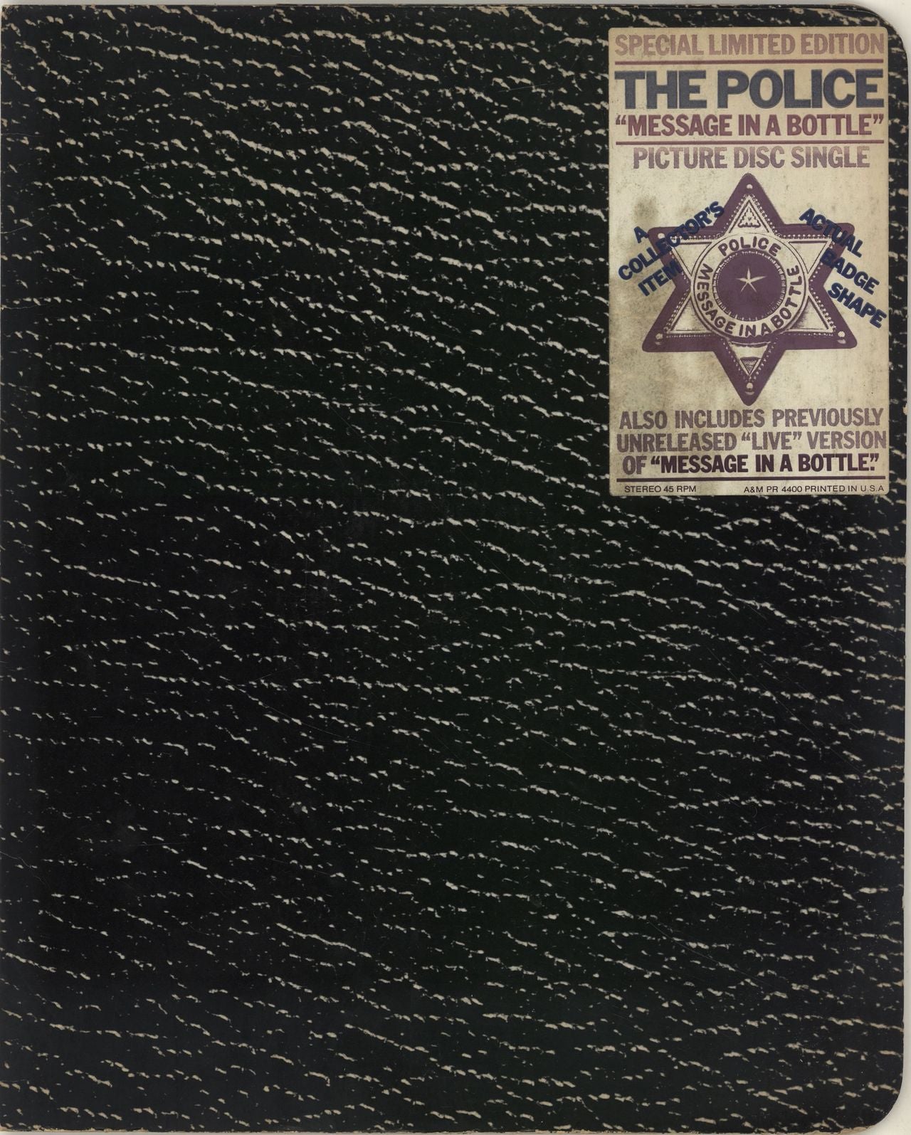 THE POLICE Message In A Bottle (Limited Edition 1980 US badge shaped Picture Disc single, including a previously unreleased 'Live' Version, housed in an A4 stickered card folder [with hype sticker] with a great moody band shotinside. The packaging shows some minor general wear, the disc itself shows some light cosmetic wear but nothing that would have impact on play PR4400)
