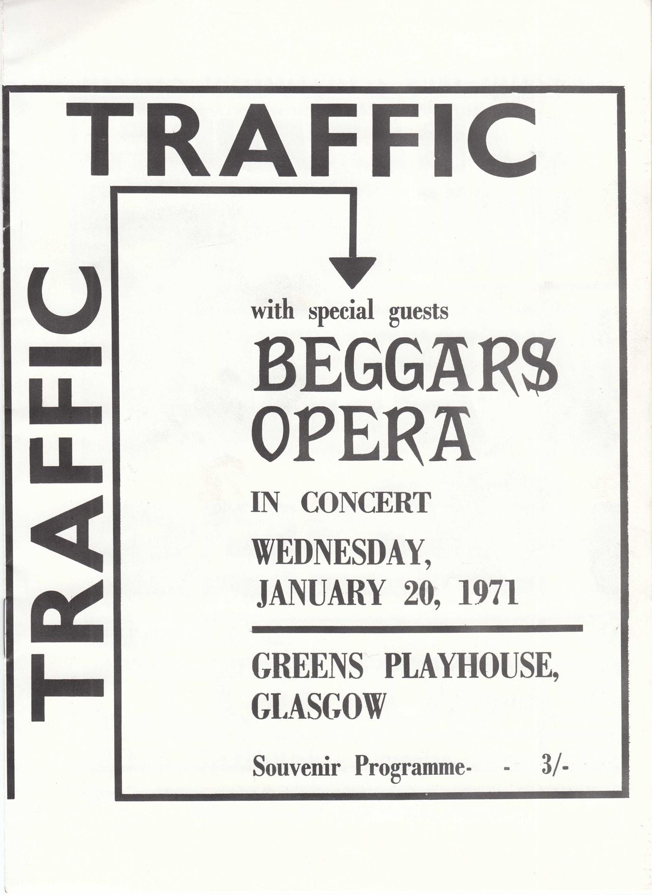 TRAFFIC In Concert (Extremely rare and genuine 1971 UK 8-page souvenir concert programme, for the groups 20th January 1971 show at Greens Playhouse in Glasgow, with special guests Beggars Opera. This unique booklet features local adverts promoting new releases and record stores, along with a black & white photo of each artist and biographical text. This is the first example we have seen and remains in an unbelievable condition, this has been stored and looked after for over 50 years. But that is not all, this also comes with an original ticket stub for the show. A must have item for any fan!)