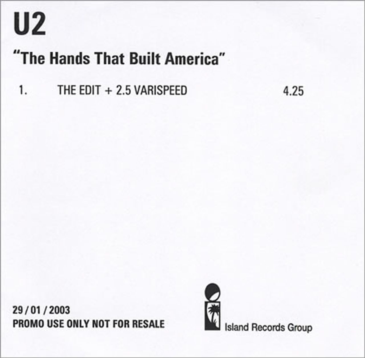 U2 The Hands That Built America | The Edit +2.5 Varispeed Mix (Released as a rare promotional-only CD-R in 2003, The Hands That Built America is U2's emotionally charged contribution to the 'Gangs of New York' film soundtrack. This special edition features The Edit + 2.5 Varispeed Version (4:25), offering a shorter tempo to better suit filmic pacing, making it a unique variant and highly sought after. Housed in a custom Island Records title inlay, this official UK promo features a custom printed white disc and was never intended for commercial sale. A compelling mix of orchestral elegance and Bono’s unmistakable vocal gravitas, the track earned an Academy Award nomination for Best Original Song and won the Golden Globe in 2003)