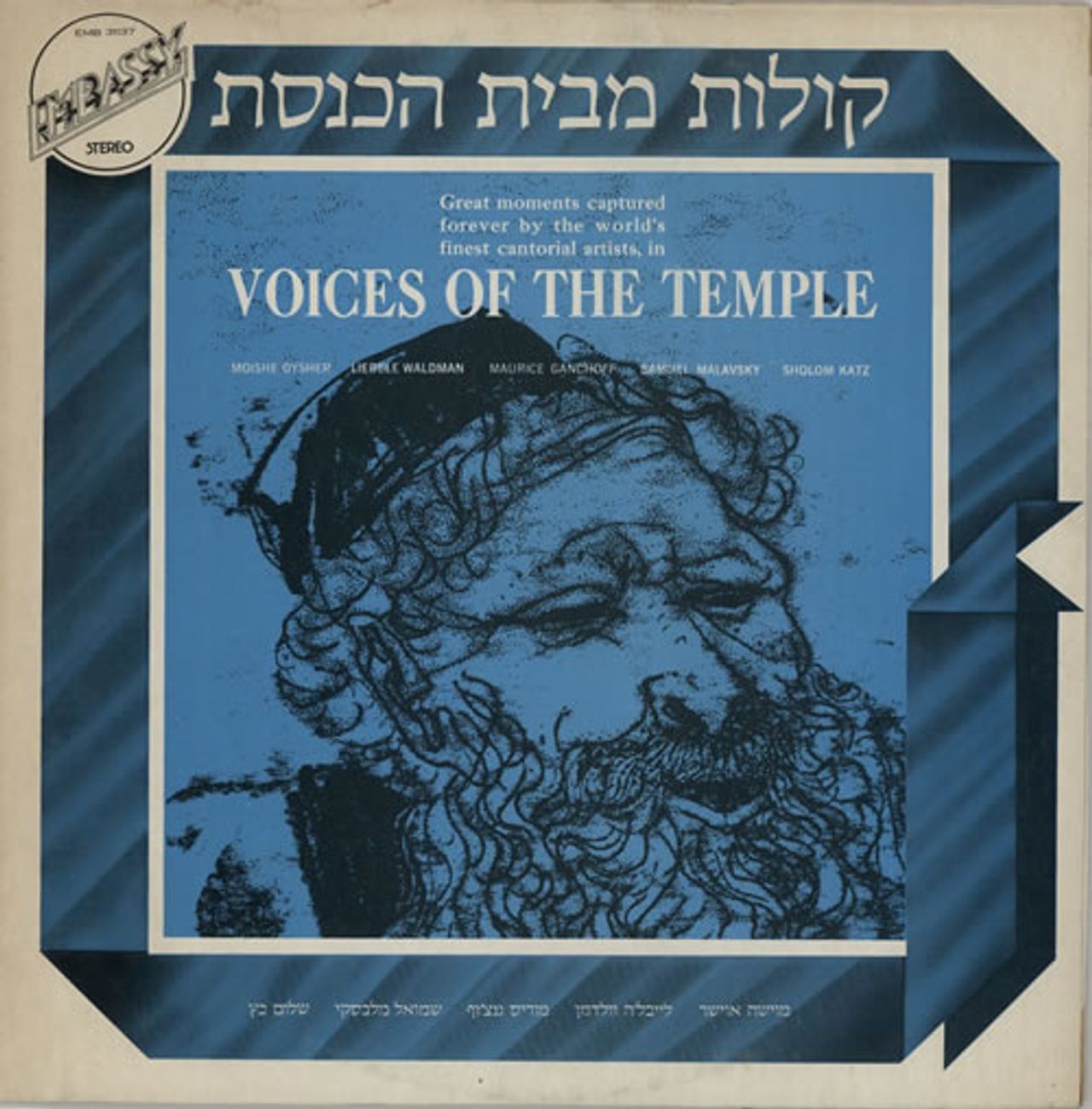 VARIOUS Voices Of The Temple (70s Israeli only 9-track LP featuring some of the greatest moments by some of the world's finest Cantorial artists, including Moishe Oysher, Liebele Waldman, Maurice Ganchoff, Samuel Malavsky & Sholom Katz, picture sleeve. The sleeve shows a little light shelfwear with some age yellowing at the edges but the vinyl remains excellent & shows little sign of play EMB31137)