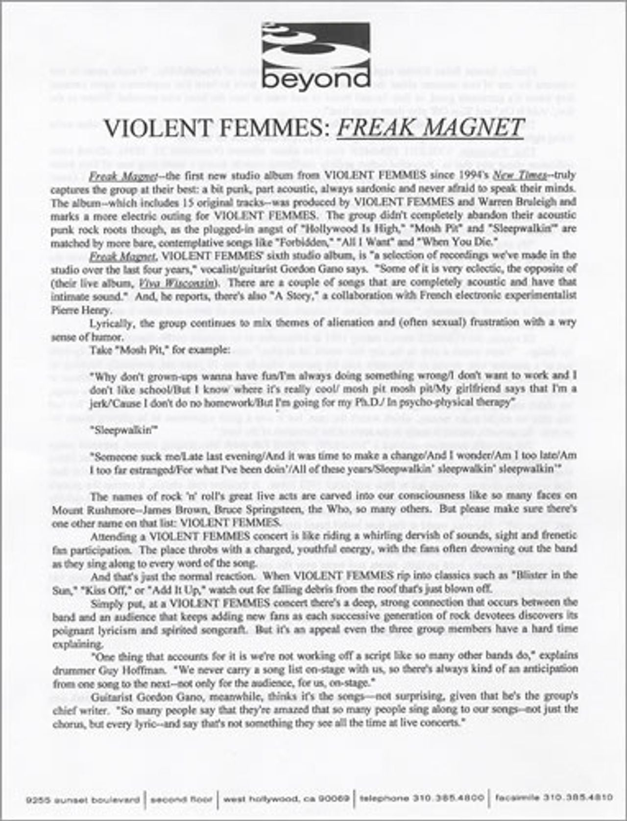VIOLENT FEMMES Freak Magnet (2000 US Beyond label promotional only press pack including a 2-page press release plus an 8" x 10" black & white group publicity photo credited to Joseph Cultice)