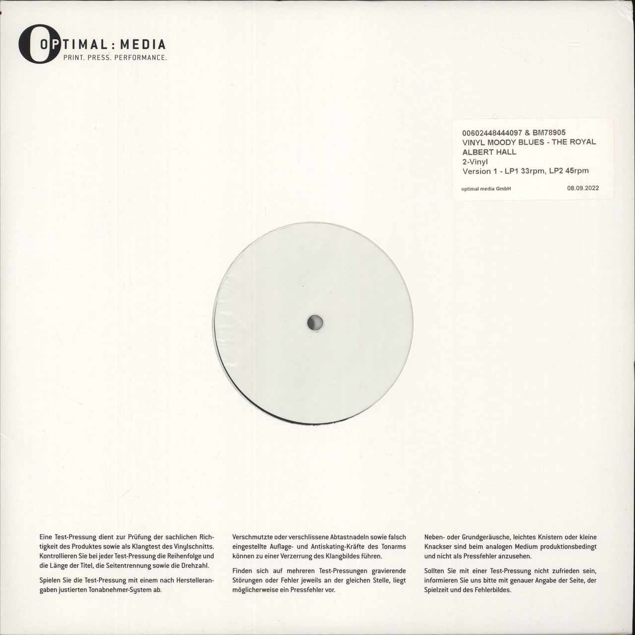 THE MOODY BLUES The Royal Albert Hall Concert: Dec. 1969 (2022 UK/EU 14-track white label vinyl 2-LP test pressing with A1/B1/C1/D1 matrices, for the limited edition release comprising 11 new stereo mixed tracks plus three additional tracks ona Bonus 12" Single - Recorded in December 1969 by Decca Records, this legendary concert was the highlight of the Moody Blues Threshold Roadshow UK Tour of that year, promoting both the band's latest album, To Our Children’s Children's Children and other acts on the Moody Blues' recently established label, Threshold. These were pressed in limited run, one of only a small handful made, usually to test the sonics only. This has plain white labels, housed in a 'Optimal Media' company die-cut card sleeve with an information sticker attached, dated 08.09.2022. This remains in a near mint condition)