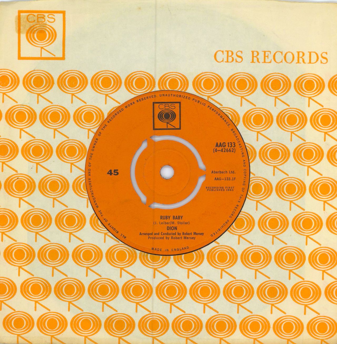 DION Ruby Baby (1963 UK 7" vinyl single with intact three prong centre, also including He'll Only Hurt You, CBS company die cut paper sleeve AAG133)
