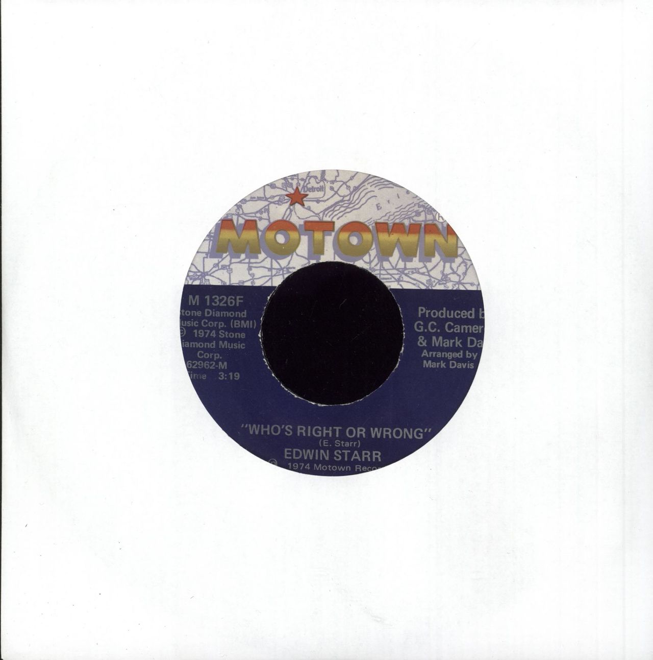 EDWIN STARR Who's Right Or Wrong (Funky Modern Soul 1974 US wide centred 7" single with juicy wah-wah guitar & deep grooves, also featuring Lonely Rainy Days In San Diego, plain die-cut sleeve. The vinyl grades EX/EX- with just the odd faint cosmetic sign of play M1326F)