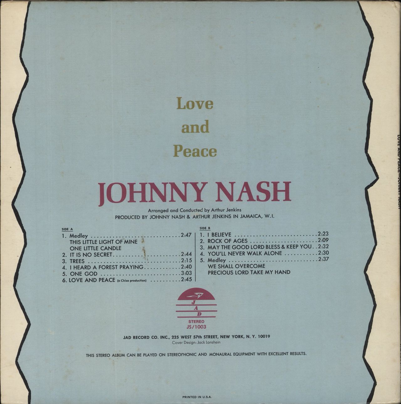 JOHNNY NASH Love And Peace (1969 US 11 track vinyl LP including 'One God', Rock Of Ages' & 'I Believe'. Housed in an unusual die-cut picture sleeve with a 3D like image inserted of Johnny Nash . Both sleeve and vinyl presented in 'Excellent'condition JS-1003)