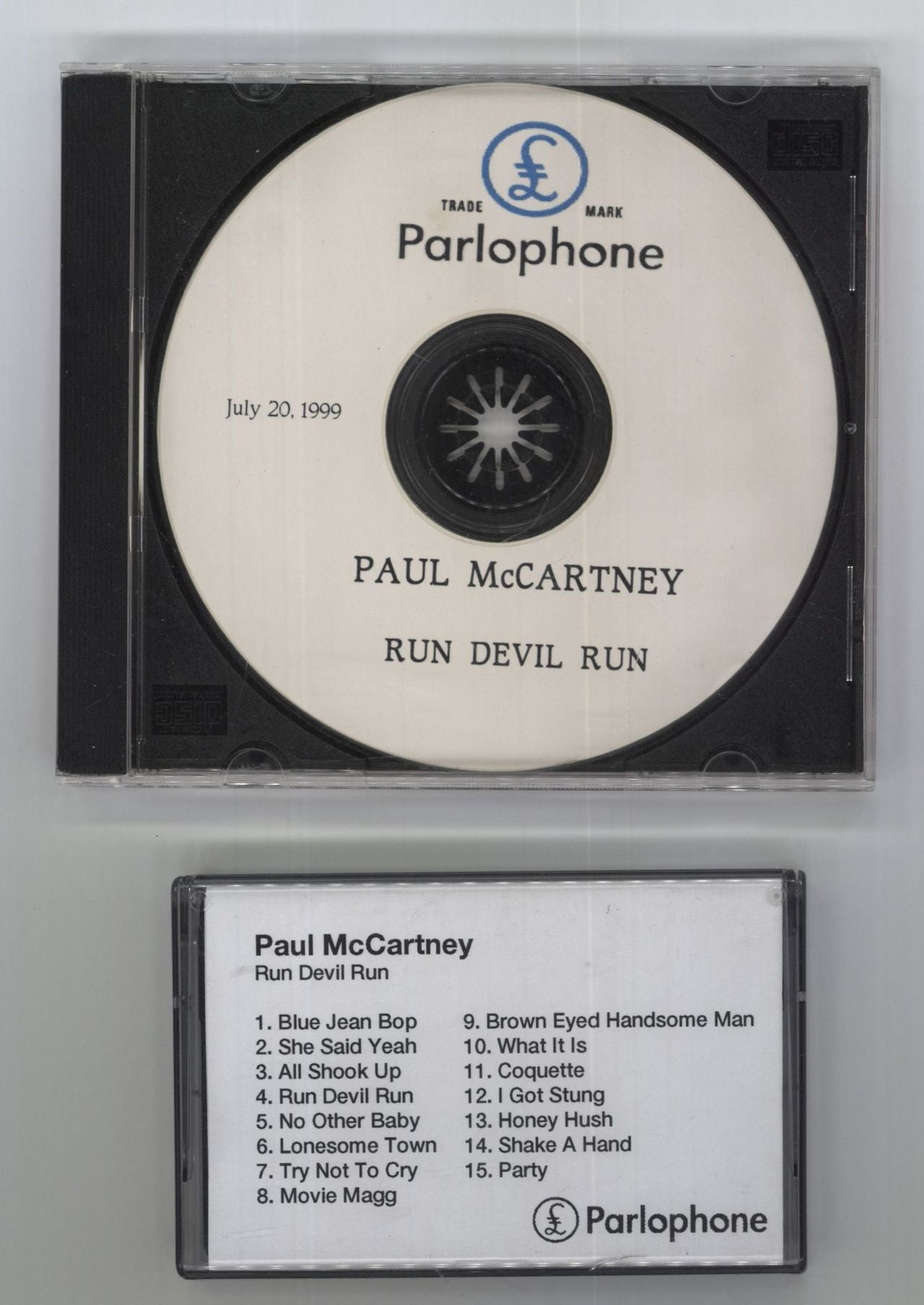 PAUL MCCARTNEY Run Devil Run (Rare 1999 UK in-store promotional only press kit, from the Parlophone Creative Deptment comprising the 'Run Devil Run - Party Piece' PAL Video Electronic Press Kit, featuring Paul talking about the album with a running time of six minutes, with a custom printed stickered cassette shell in a die-cut card slipcase sleeve. Also includes a copy of the full album on promo cassette and CD-R. Along with a one page letter addressed to the 'Store Manager' aboutthe video and one page press release about the release of the album)