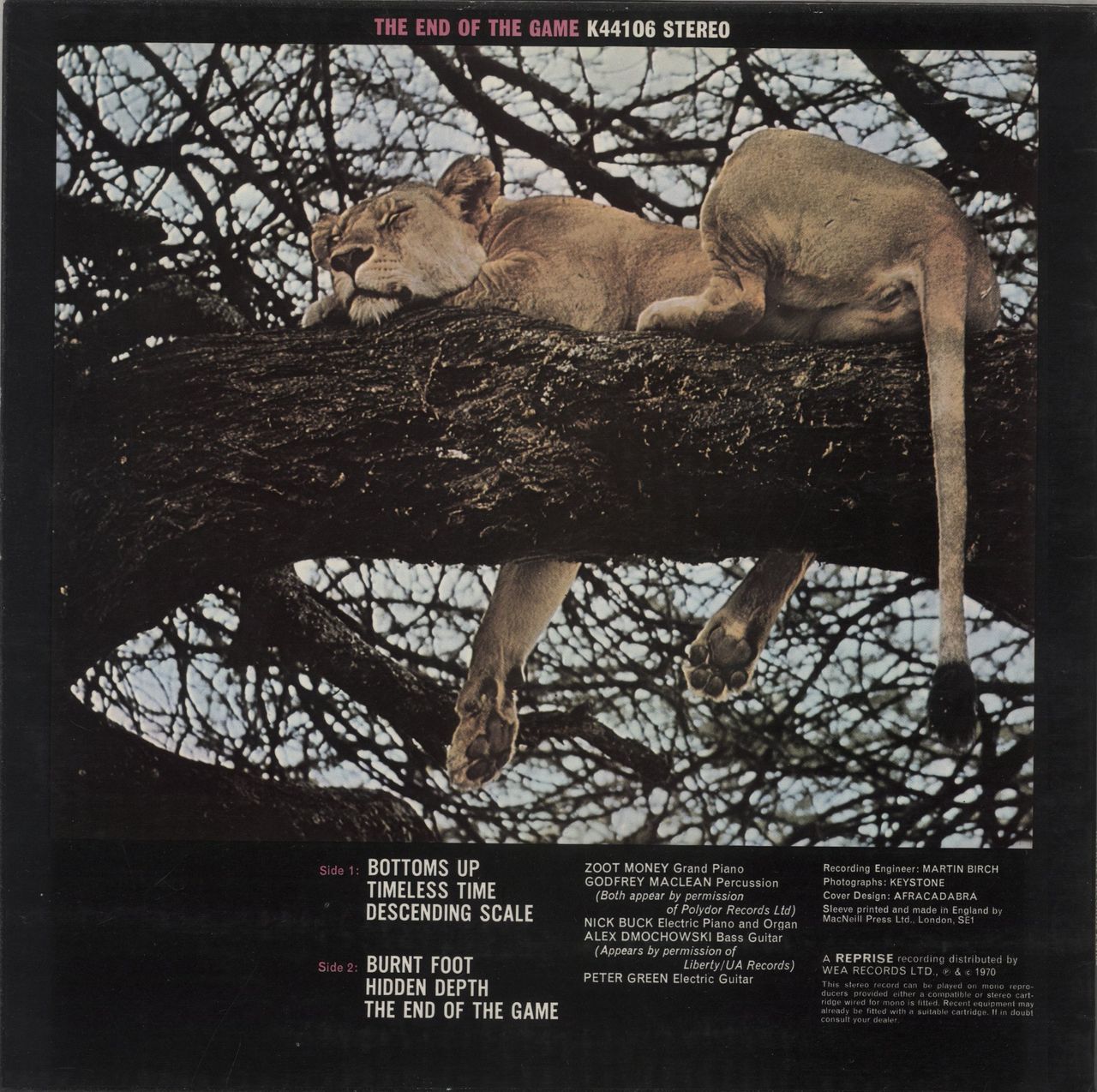 PETER GREEN The End Of The Game (1972 UK second issue of the 1970 6-track vinyl LP on the tan Reprise 'steamboat' label, fully laminated picture sleeve. The sleeve shows some minor laminate lift to spine whilst the vinyl remains in Excellent condition K44106)