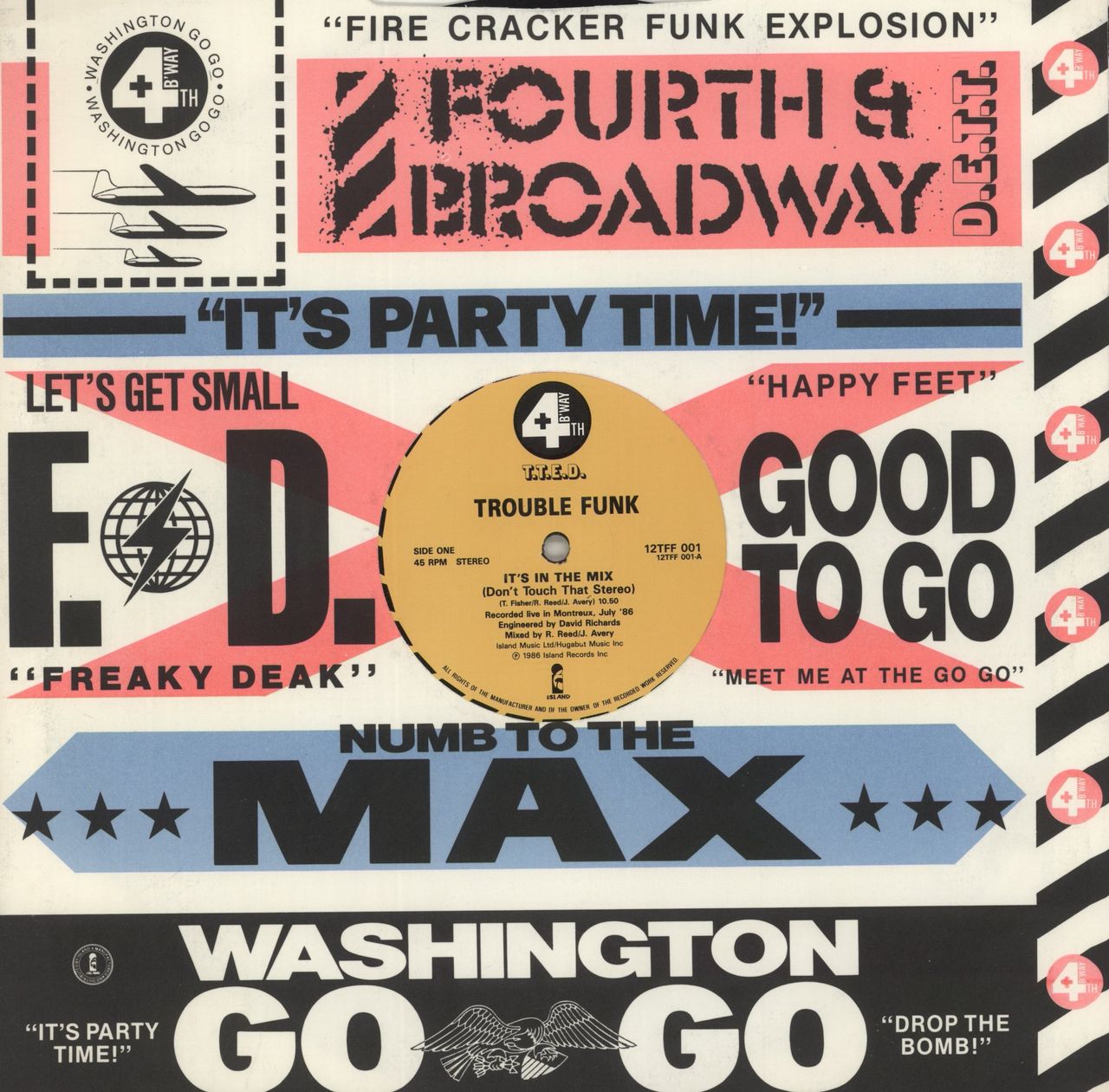 TROUBLE FUNK It's In The Mix (Don't Touch That Stereo) (1986 UK 12" vinyl single, also featuring Still Smokin', die cut company card sleeve 12TFF001)