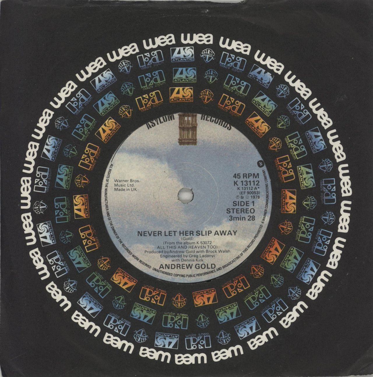ANDREW GOLD Never Let Her Slip Away (1978 UK solid centre 7" vinyl single, also including Looking For My Love, die-cut paper sleeve K13112)
