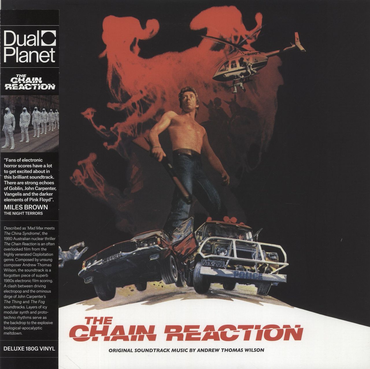 ANDREW THOMAS WILSON The Chain Reaction (2014 Australian limited edition 14-track LP pressed on 180 gram Milky Clear with Red Haze Vinyl, featuring the soundtrack to the Australian nuclear thriller - a superb piece of 1980s electric film scoring. Housed in a picture sleeve with illustrated credits inner and obi strip. The sleeve is Excellent with some scuffing and pressure marks. The vinyl reveals minimal signs of play DUAL011LP)