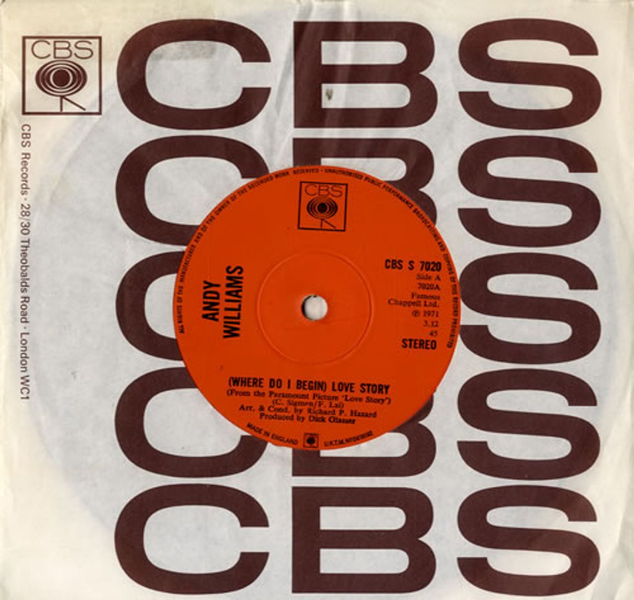 ANDY WILLIAMS (Where Do I Begin) Love Story (1971 UK solid centre 7" vinyl single, also including a cover of George Harrison's 'Something', CBS company die cut paper sleeve CBSS7020)