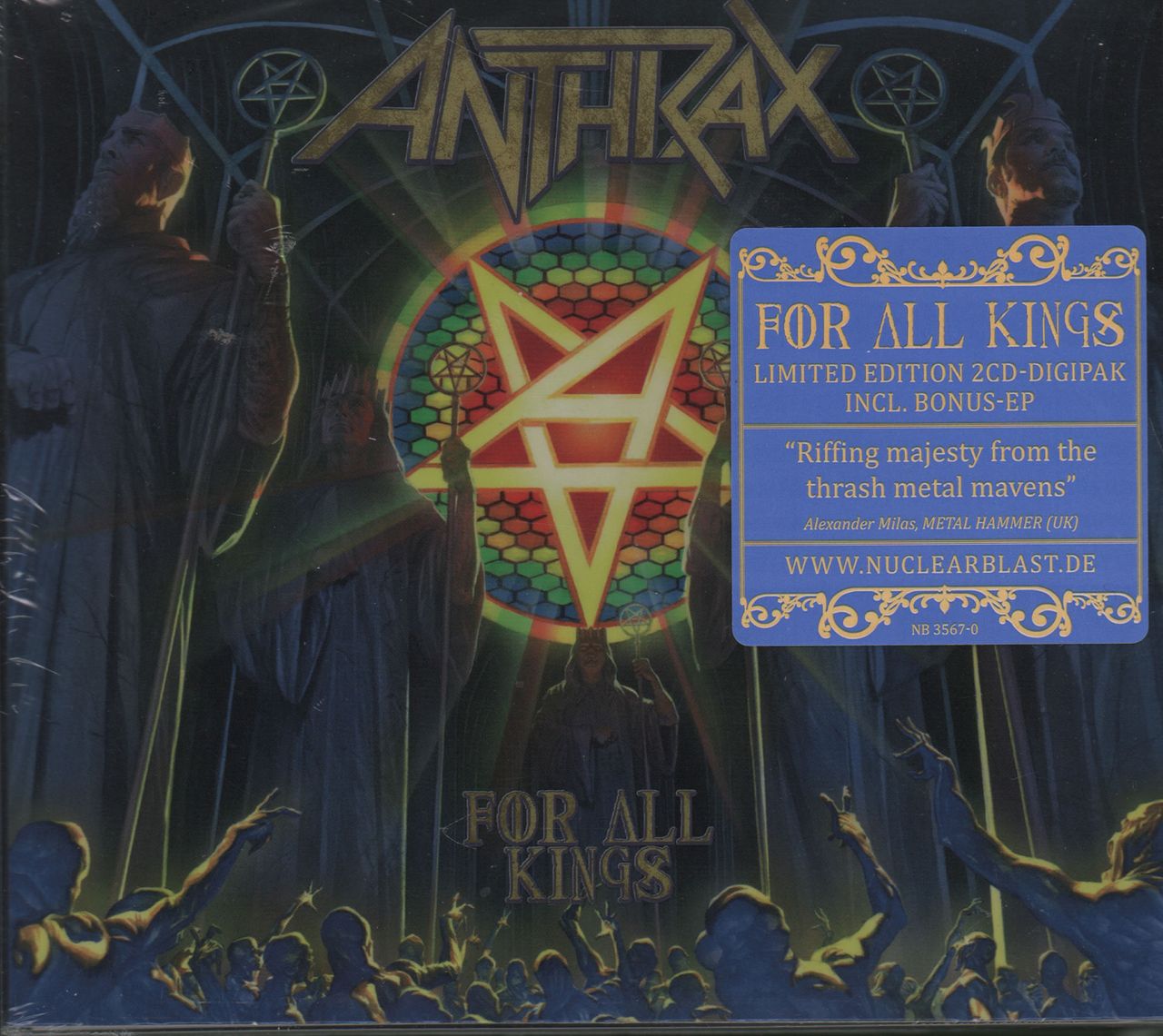ANTHRAX For All Kings (2016 UK limited edition 2-CD set comprising the 13-track CD album featuring the singles Evil Twin & Breathing Lightning plus a Bonus EP including live versions of Fight 'Em 'Til You Can't, A.I.R., Caught In A Mosh& Madhouse. Both discs are housed within the custom-stickered & sealed fold-out card sleeve with artwork by Alex Ross and a title-screenprinted translucent slipcase! NB3567-0)