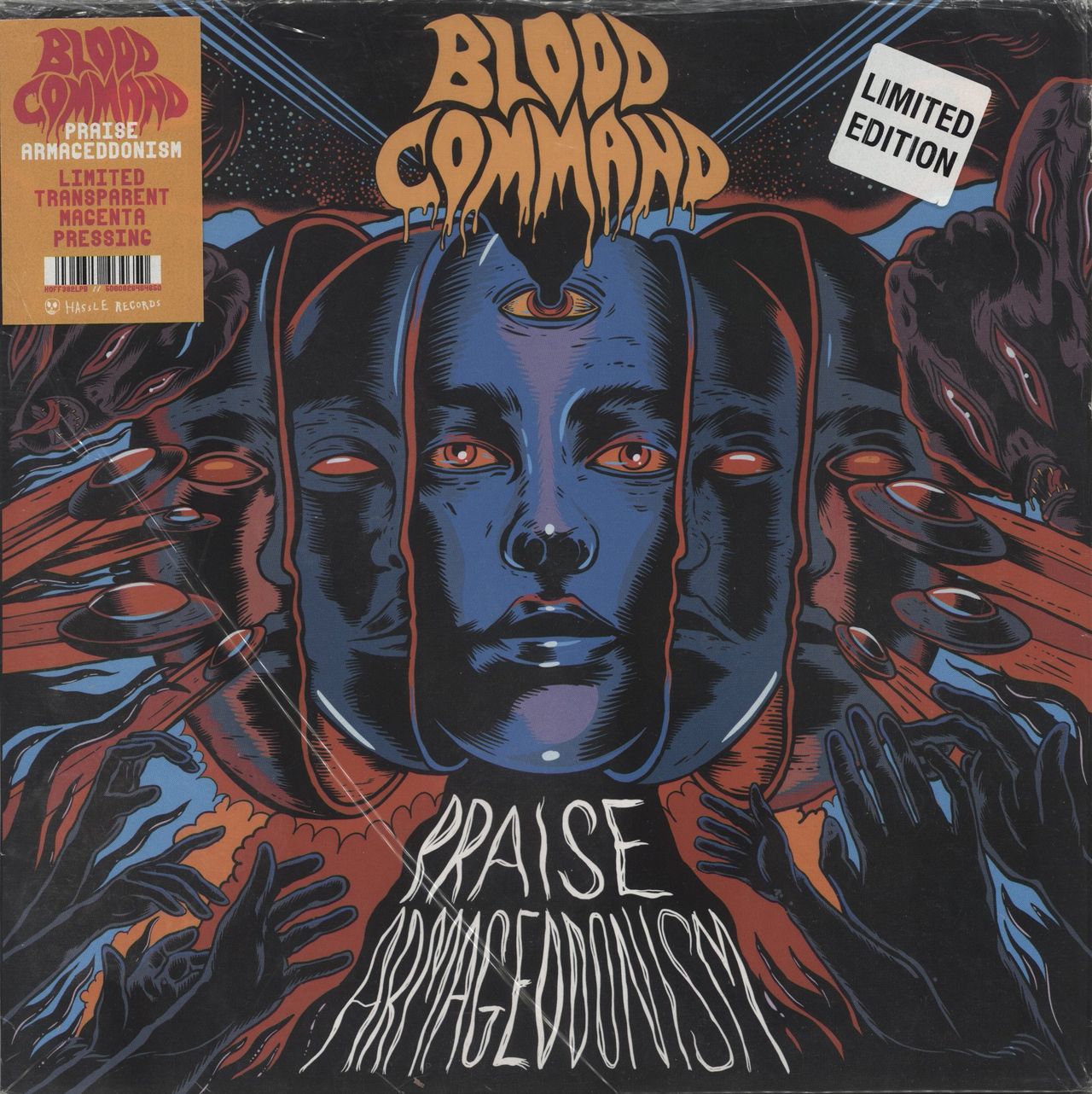 BLOOD COMMAND Praise Armageddonism (2022 Polish Limited Edition 12-track LP pressed on Magenta Vinyl, the fourth album from the Norwegian punk/hardcore band, picture sleeve with fold-out illustratedlyric insert and outer hype stickered PVC sleeve. The cover has one area of corner wear and otherwise very little wear, while the vinyl looks barely played HOFF382LPB)