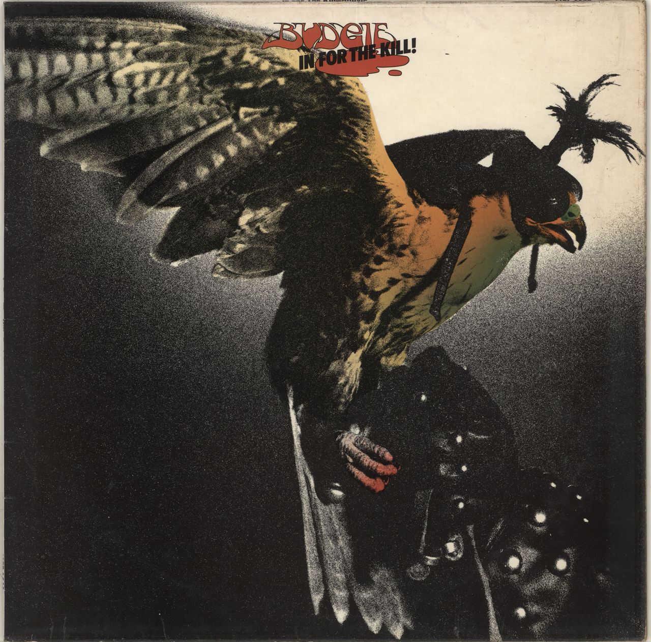 BUDGIE In For The Kill (1974 UK dark MCA rainbow label 7-track vinyl LP, the fourth album from the Welsh rock group including Zoom Club and a re-recording of Crash Course In Brain Surgery [later covered by Metallica on their 1987 EP Garage Days Re-Revisited], fully laminated picture sleeve. The sleeve [VG} has some small nicks in the opening edge, a corner crease and some notable general edgewear; the vinyl has a few light surface scuffs MCF2546)