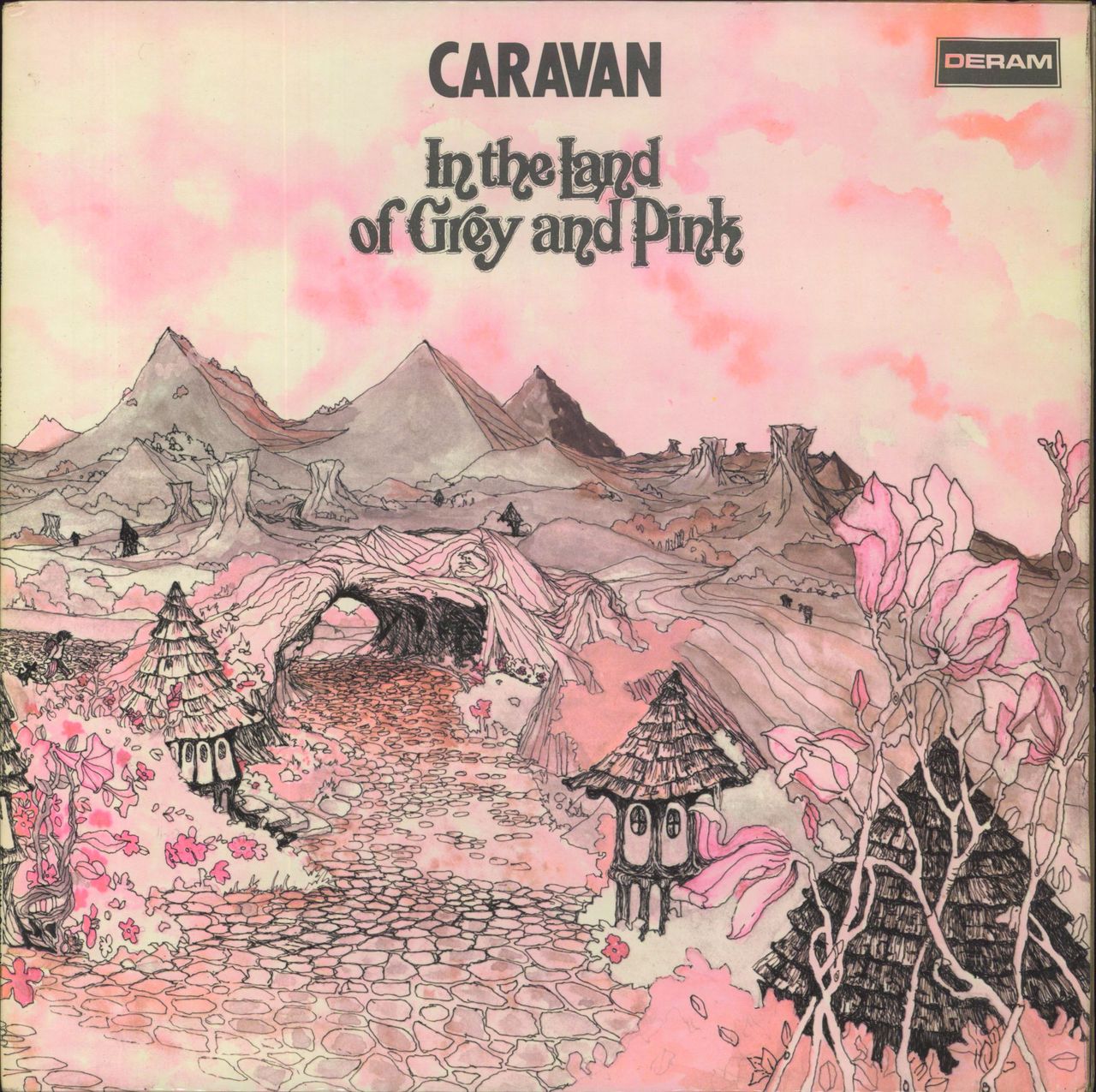 CARAVAN In The Land Of Grey & Pink (Mid 70s UK second issue of the 1971 5-track LP on the red & white Deram label, the band's third & most well-known album, considered a classic by fans & critics alike [the album recently received a remastering overhaul by Porcupine Tree's Steven Wilson], front laminated gatefold picture sleeve featuring cover art by Anne Marie Anderson. The sleeve displays light shelfwear, the label Side 1 has some looseness through age/storage, the disc itself however remains excellent with few minor paper hairline scuffs & spindle marks to show light play, featuring the glorious Nine Feet Underground gracing all of Side 2, behold! SDL-R1)