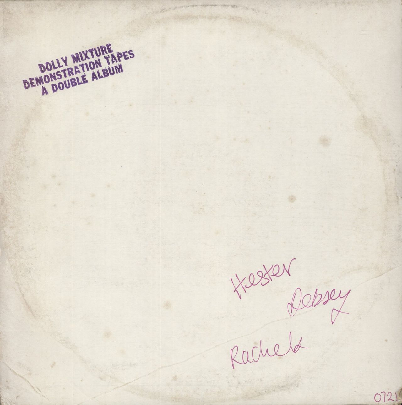 DOLLY MIXTURE Demonstration Tapes (Limited Edition 1984 UK private press 27-track double LP, with custom printed black on white labels & hand etched messages in the run-outs. Comes housed in a plain white card sleeve which is rubber stamped inthe top left corner with the artist/title detail with the IDS distribution sticker on the back. The front of the sleeve is individually numbered & signed by the trio - Debsey Wykes, Rachel Bor & Hester Smith - as per release, in purple markerpen. The Dolly Mixture London headquarters is also written in green pen on the back, complete with the double-sided cartoon/lyric insert. Limited to just over 2000 copies, the sleeve exhibits some corner scuffing, discolouring & the odd crease from ring wear & grades Very Good. The vinyl is nice & clean & grades VG+ with some light paper hairlines & spindle marks not affecting play)