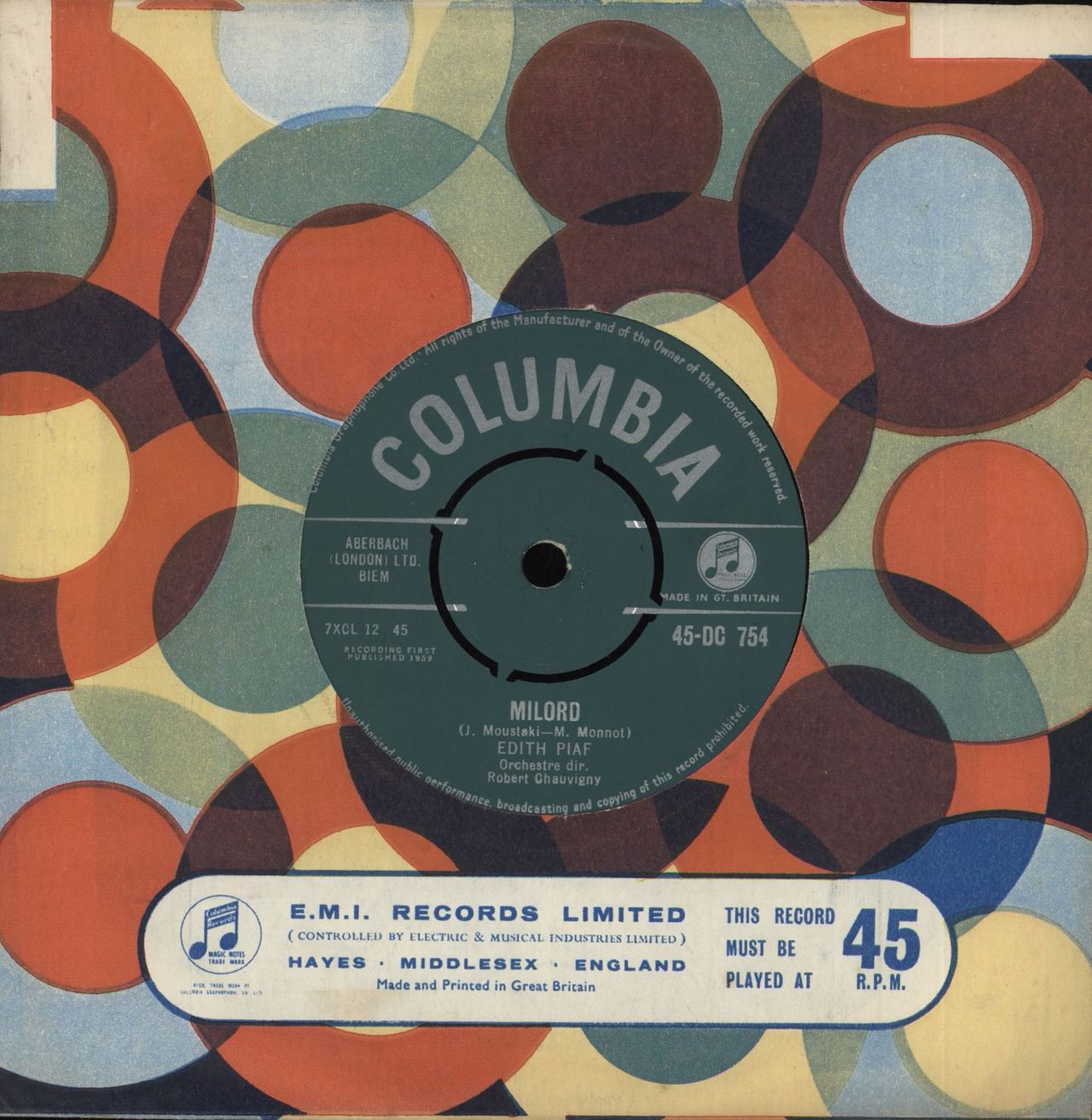EDITH PIAF Milord (1959 UK 7" vinyl single with intact four prong centre, also including Je Sais Comment, Columbia company die cut paper sleeve 45-DC754)
