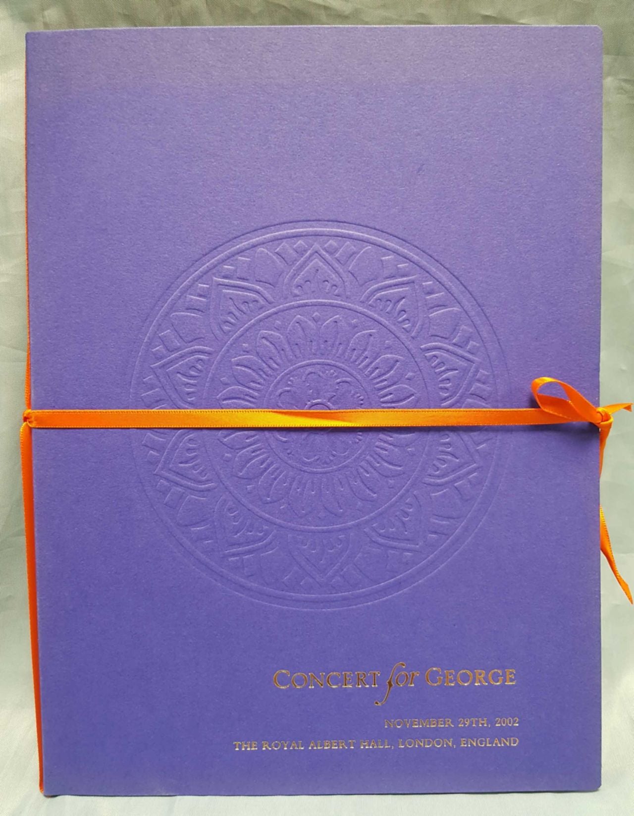 GEORGE HARRISON / VARIOUS Concert For George (Superb concert programme for the event held at The Royal Albert Hall, London on the 29th November 2002 - the first anniversary of George's death. The programme features several beautifully presented photographs of George and many quotes. It measures 10" x 7" with embossed purple cover, gold titles and an orange ribbon tie. A stunning high-quality piece of memorabilia, complete with the original fold out schedule of events with full listofartists appearing)