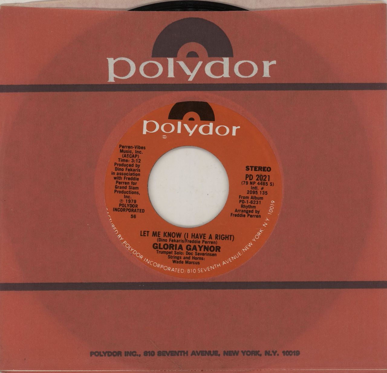 GLORIA GAYNOR Let Me Know (I Have A Right) (1979 US wide centred 7" vinyl single, also including One Number One, Polydor company die-cut paper sleeve PD2021)