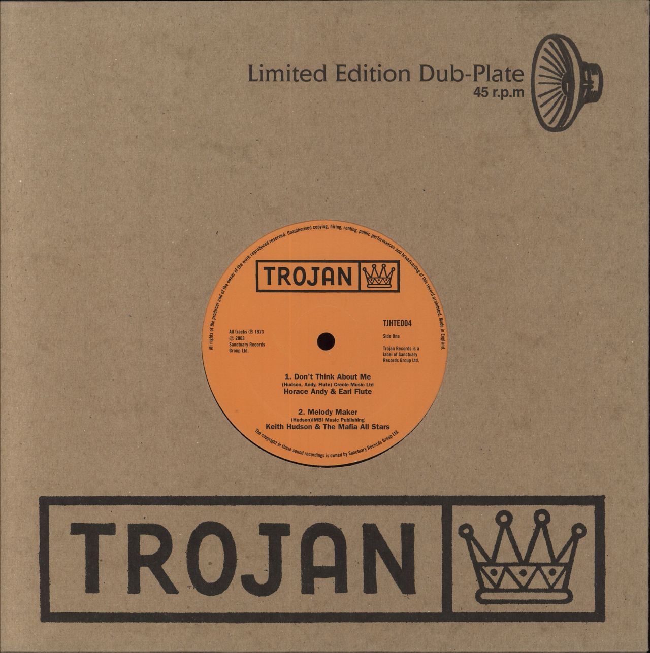 HORACE ANDY Don't Think About Me (2003 UK Limited Edition 4-track 10" EP, featuring Horace & Earl Flute's 1973 ruff & tuff offering for the Creole label as well as Keith Hudson's Melody Maker, Jah Woosh's I'm Alright & the Dub cut of Don't Think About Me by The Mafia All Stars - an epic Version Excursion! Housed in a die-cut Trojan sleeve, the vinyl is clean & grades EX/EX- with just the odd faint paper scuff not affecting play TJHTE004)