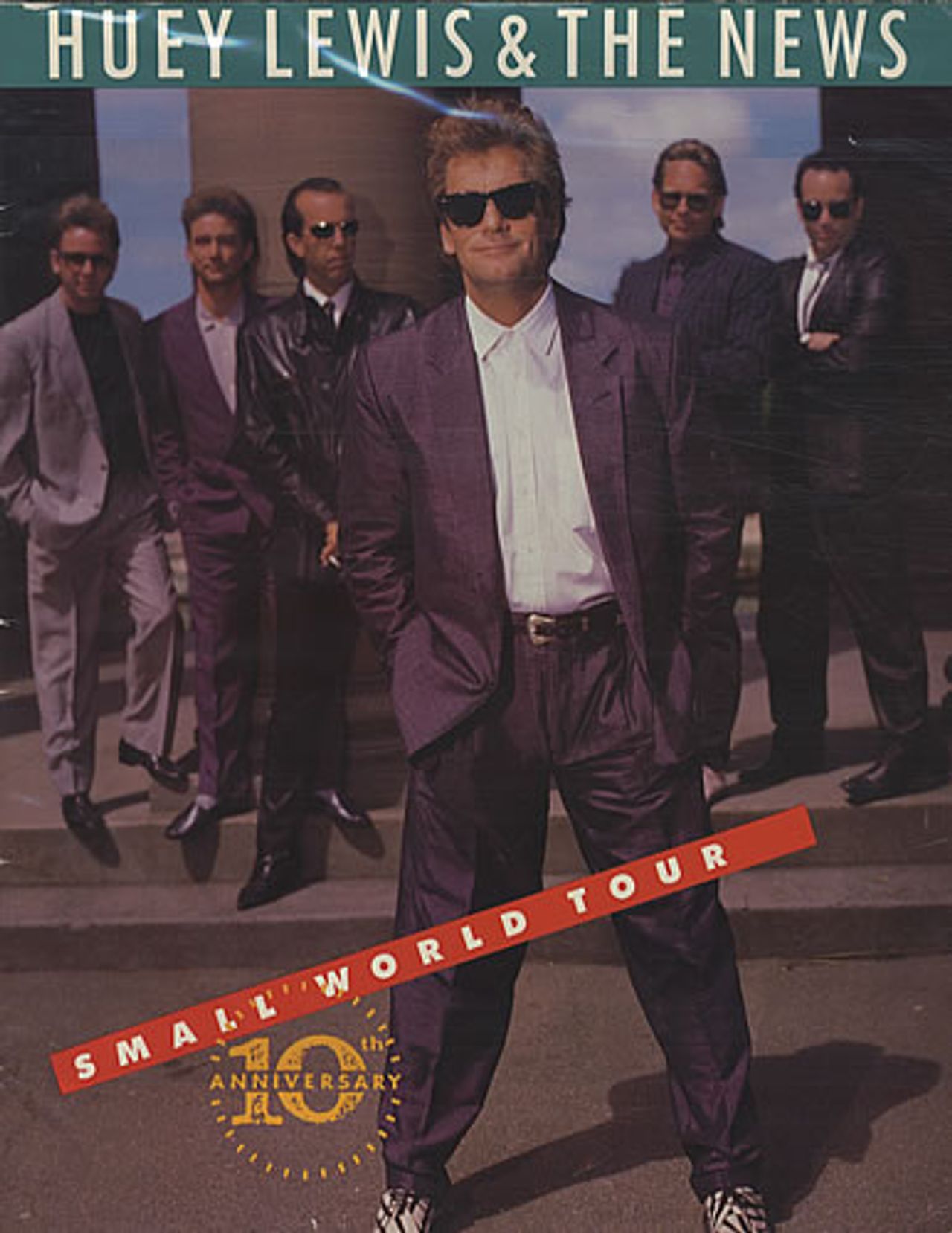 HUEY LEWIS & THE NEWS Small World Tour (Official 1988 US 36-page 14" x 11" tour programme issued during their 10th Anniversary 'Small World' tour and is packed with photos taken throughout the years, complete with the fantastic glossy picturecover. The cover has only a few light signs of age & storage whilst the inner pages are superb)
